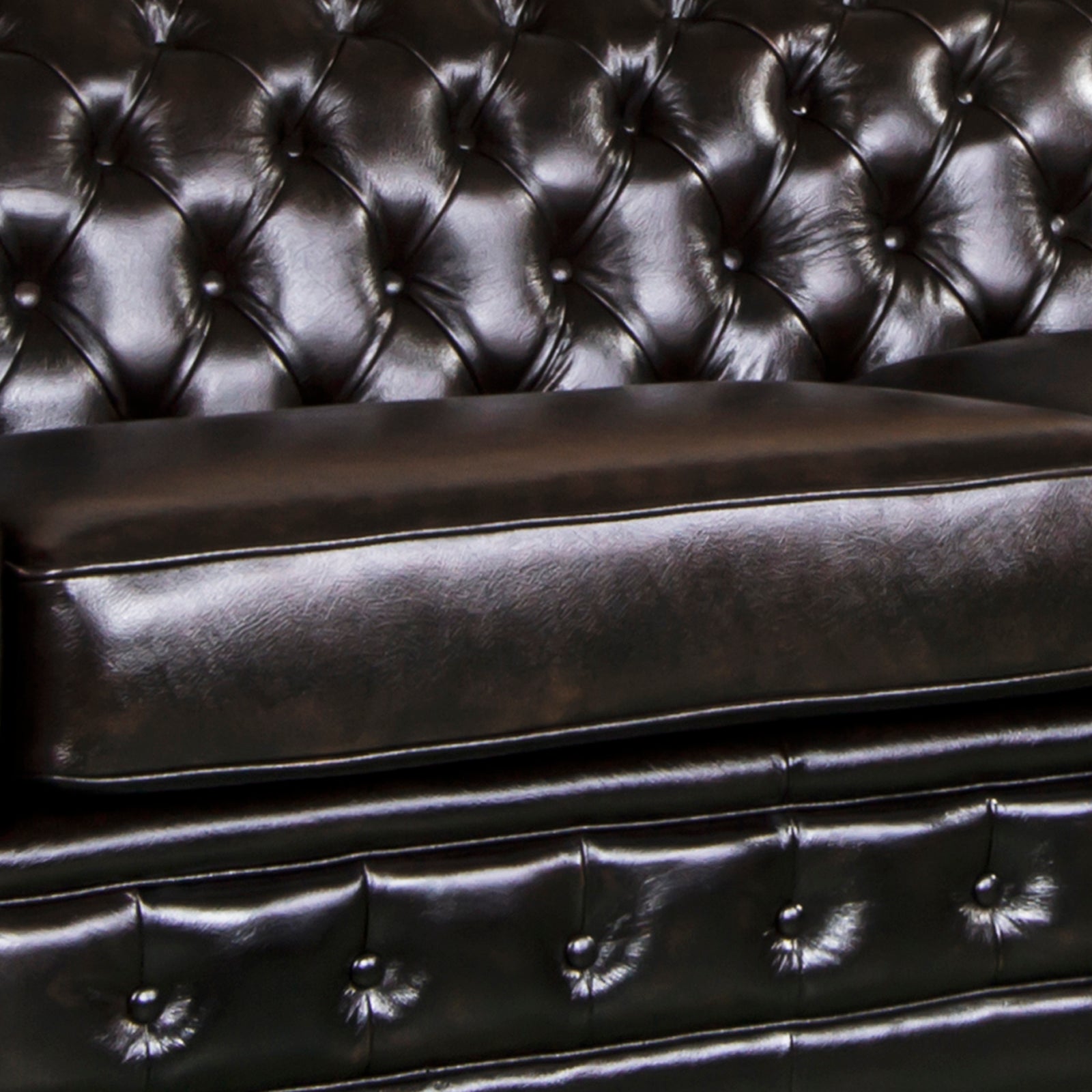 This leather sofa adds a gentle sophistication in your living room, bedroom or entryway. Featuring scroll backrest and arm, genuine leather upholstery, fluffy cushions and gorgeous button tufted design. This elegant accent piece provides functionality and can easily become the focal point of any home.