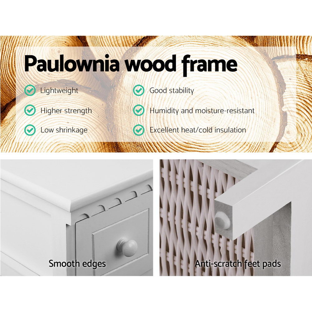 Looking for that cottagecore aesthetic without moving to the countryside? Add a chic, rustic presence to your home with the Artiss 3-basket Cabinet. Beautifully crafted in an endearing combination of Paulownia wood, MDF board, plywood and PP material, this cabinet evokes a charming, simple living feel and is useful in so many ways. The design has a timeless appeal, and its practicality is enhanced by the two deep drawers and three movable baskets with cloth liners that are washable for easy maintenance. The cabinet will match perfectly with your existing décor thanks to its neutral white tones, so you can use it in any room. Not least, the anti-scratch feet pads will help to keep your floor in pristine condition. The cabinet comes fully assembled so you can place it straight out of the box. Get yours today and create your perfect home.