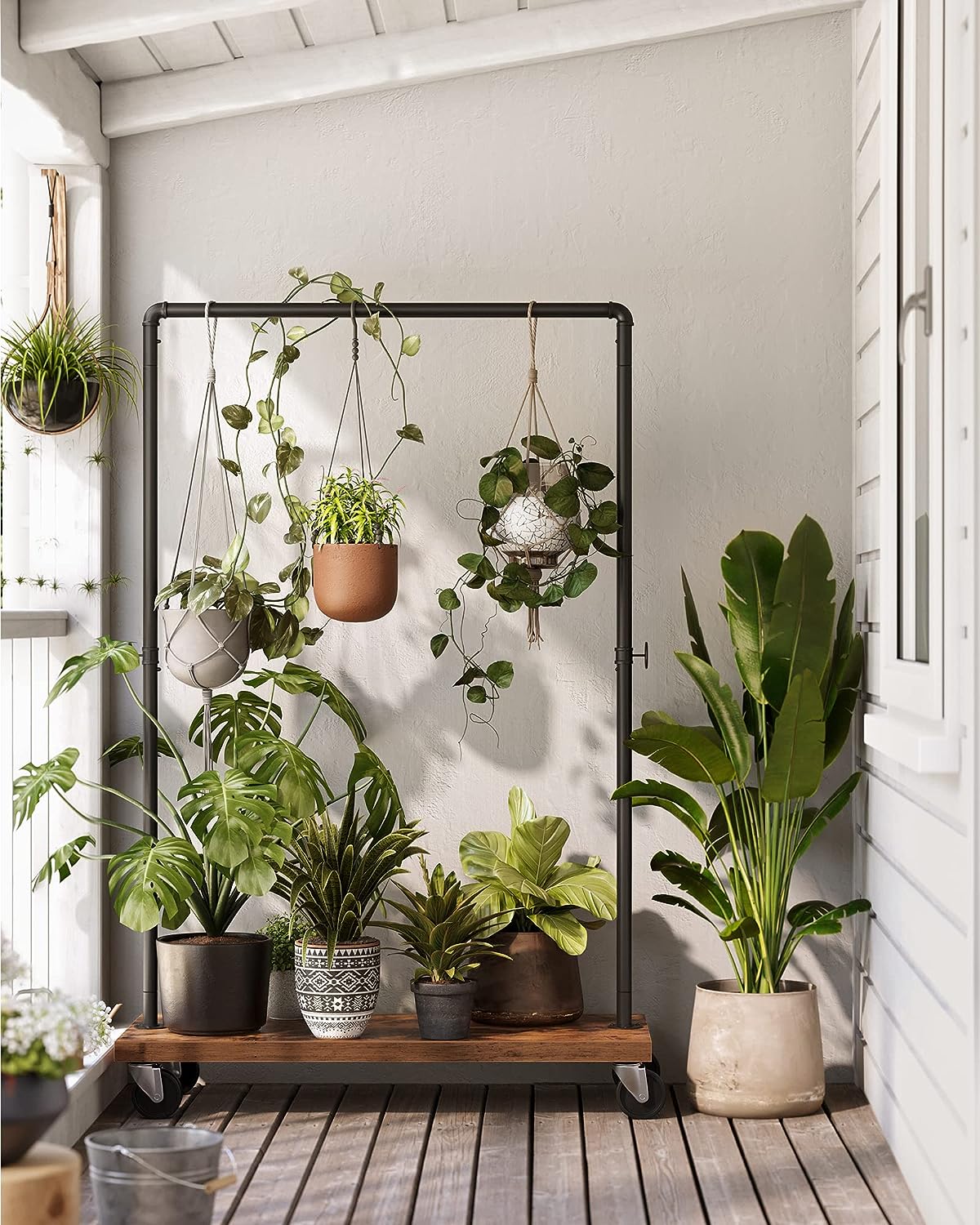 Add a touch of rustic charm to your home with this stylish hanging rack. Featuring an industrial pipe design and a sturdy shelf, it not only looks great but also provides extra storage space for your home. Show it off and enjoy the compliments.