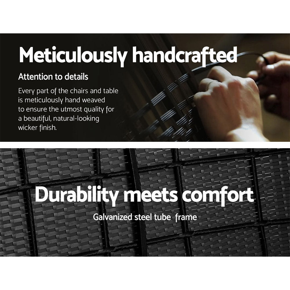 Introducing the Gardeon 4-piece Outdoor Lounge Setting Wicker in Black, a meticulously crafted set that will add panache and style to your deck, patio, or living room. Made of durable PE wicker and a sturdy steel frame, this set is designed to withstand all weather conditions and the test of time. The 5mm tempered glass top on the side table ensures safety and peace of mind. The cushion covers are also removable and washable for easy maintenance.