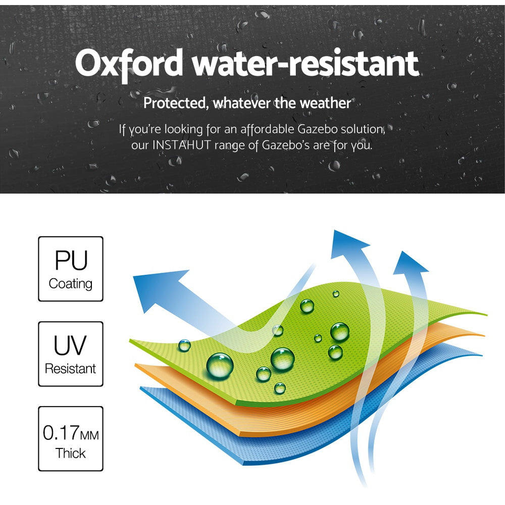 With a wide roof coverage of 300cm by 600cm, the exceptional 6kg cover is made of durable PU coating Oxford fabric that’s both UV and water resistant. No more worries about being too hot or too wet, you can get your event going with total peace of mind from the elements. Giving you ample dry cover from rain and adequate protection from UV radiation.
