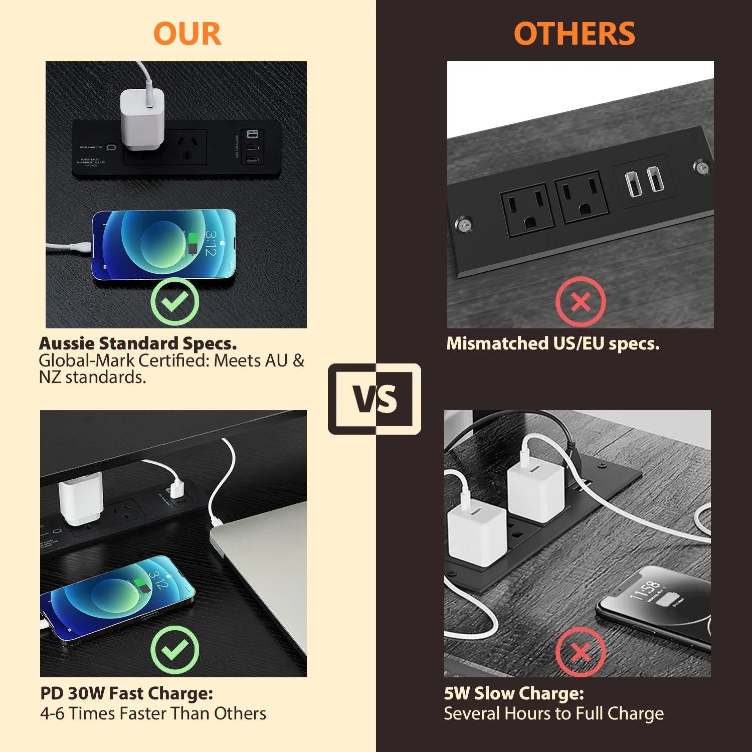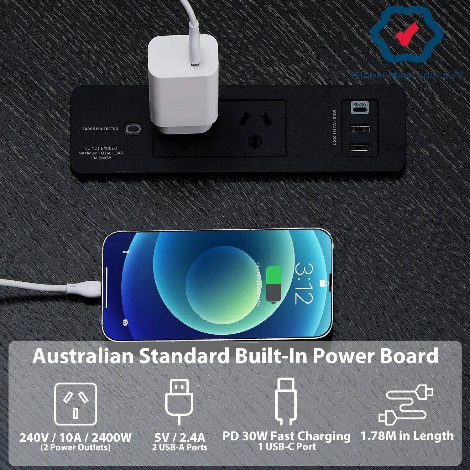 This desk is certified for electrical safety, giving you peace of mind when using electricity. It features fast charging PD 30W, USB Type-C support, and lightning and power surge protection. The flame-retardant 1.78m cord ensures reliable power supply.