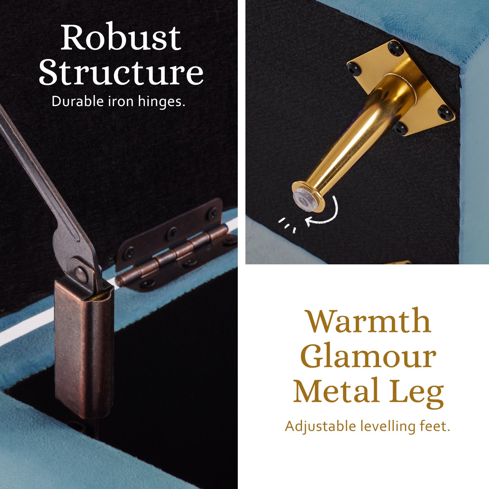 With sleek metal legs for stability, lift the lid to find a roomy interior - ideal for storing blankets and pillows discreetly. This Ottoman Storage is more than practical; it's versatile, serving as a comfy footrest or extra seating for guests.