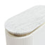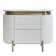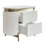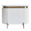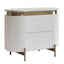 An elegant blend of form and function, the Demarco bedside table in white showcases impeccable craftsmanship. Its contemporary curves, ribbed detail, and smooth white Carrara marble top deliver an air of understated luxury. With sleek brass-finished iron legs and a gold-finished plinth, it stands as a sophisticated addition to any bedroom. Ample drawer space adds practical storage, making this piece a perfect marriage of style and utility.