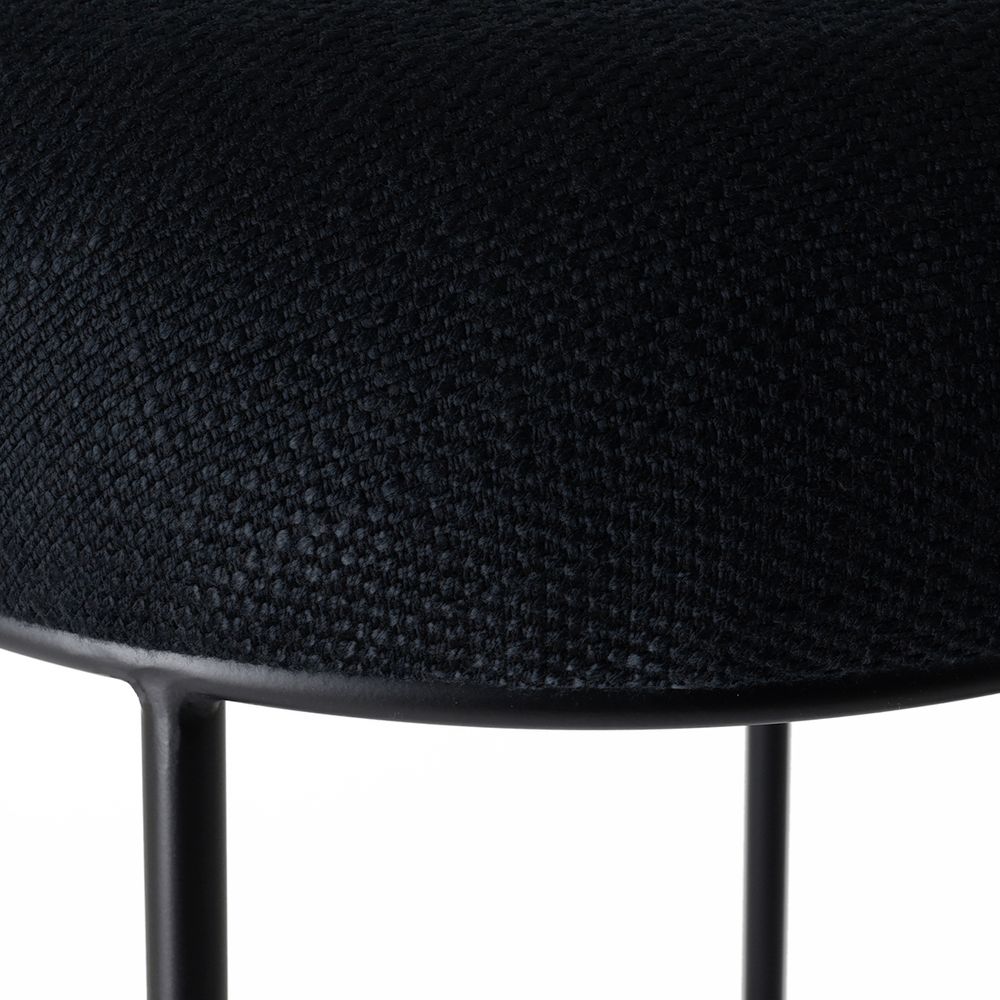The Aiden Black Steel Bar Stool – Black Linen offers a modern seating solution with a streamlined silhouette and thoughtful functionality. Crafted with a durable black iron frame and a cushioned round seat in black linen, it stands at 76cm tall, ideal for bar counters or kitchen islands. A fixed footrest at 25cm from the ground adds comfort. Part of the Aiden range, a matching Aiden Kitchen Stool version provides the same sleek style and support, perfect for dining areas in contemporary interiors.