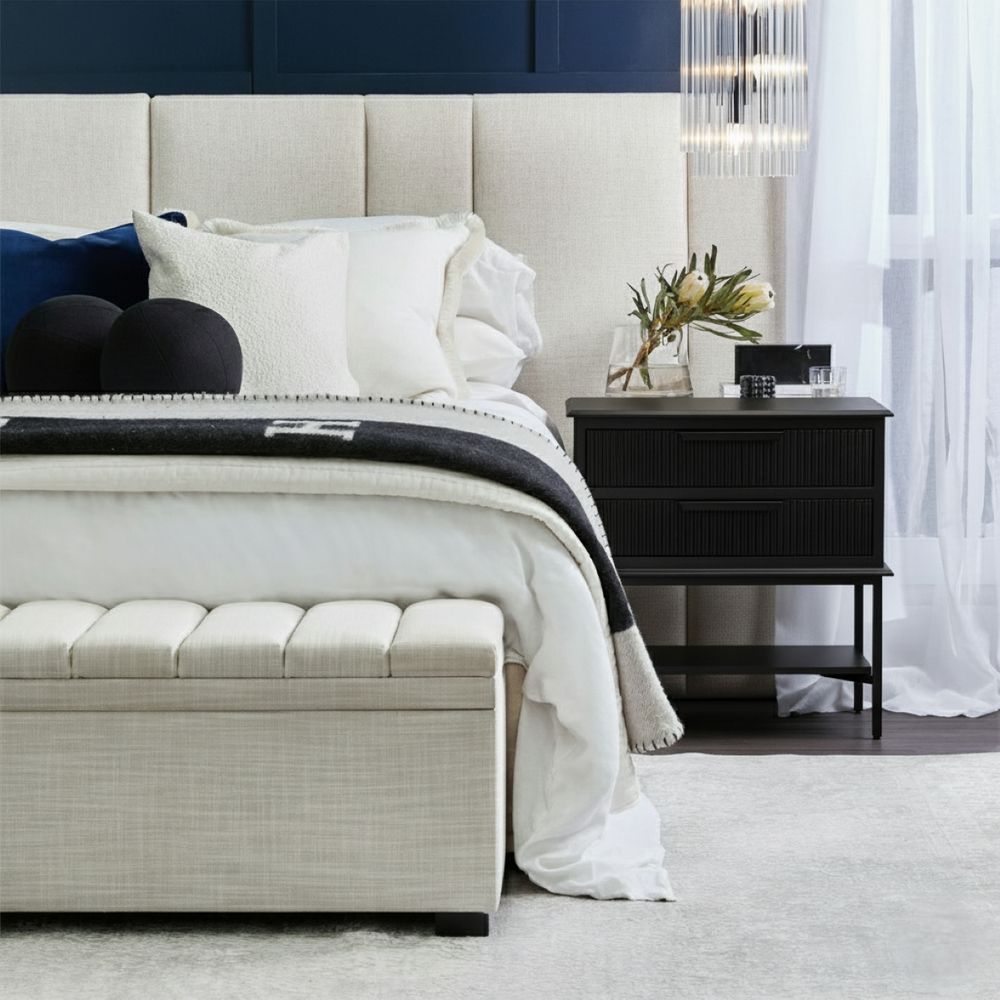 Bold in form yet refined in detail, the Aimee Bedside Table - Large offers a striking balance of elegance and functionality. Fluted drawer fronts, streamlined handles, and a spacious open shelf deliver practical storage with sculptural appeal. Its fully colour-matched finish available in All Black or All White creates a cohesive, monochrome aesthetic that complements a wide range of contemporary interiors. A versatile piece designed to bring understated sophistication to modern bedrooms.