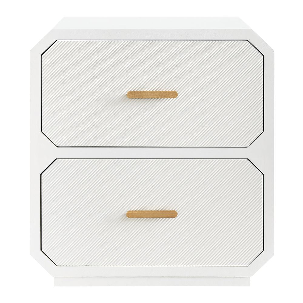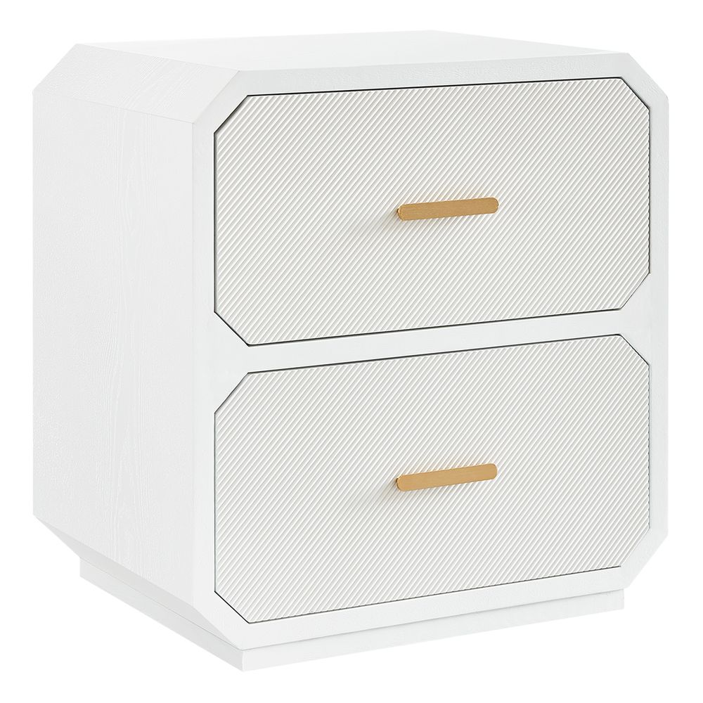 The Anderson 2 Drawer Bedside Table in White brings a fresh sense of elegance to modern interiors. Finished in painted white ashwood veneer, its clean silhouette strikes the perfect balance of form and function. Two drawers with refined diagonal texturing glide smoothly on durable metal runners, accented by gold handles for a touch of sophistication. Designed for versatility, this piece complements Hamptons, transitional, and contemporary spaces with timeless charm. Part of a range also available in Black and Antique Gold.
