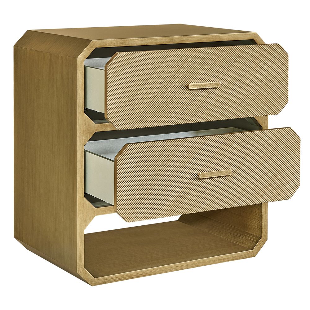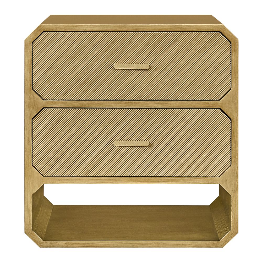 The Anderson 2 Drawer Bedside Table in Antique Gold brings luminous warmth and timeless sophistication to contemporary bedrooms. Expertly crafted in ashwood veneer with a brushed antique gold finish, it measures 70cm wide, 50cm deep and 80cm high. Two spacious drawers feature subtle diagonal texturing and glide smoothly on durable metal runners, complemented by sleek gold handles. Perfect for Hamptons, transitional and modern interiors, this versatile piece enhances any setting with radiant style. Also available in Black and White finishes.