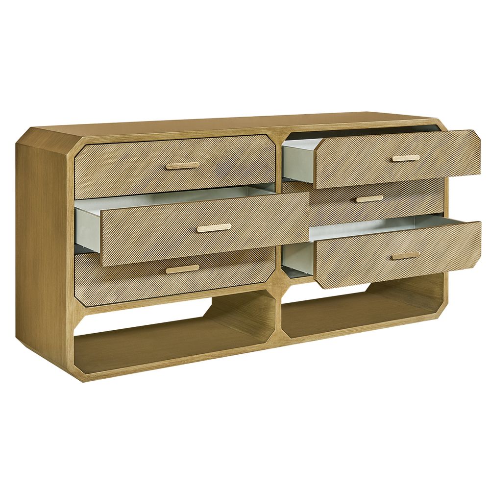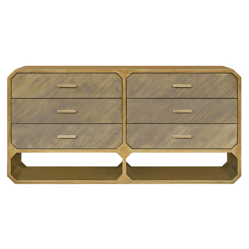 The Anderson 6 Drawer Chest in Antique Gold exudes refined glamour and generous practicality. Finished in brushed antique gold over ashwood veneer, this striking piece brings warmth and sophistication to modern interiors. Six spacious drawers feature subtle diagonal texturing and glide smoothly on durable metal runners, accented with sleek gold handles for an elegant touch. Designed to balance form and function, its bold silhouette makes a timeless statement in bedrooms, living areas, or entryways.