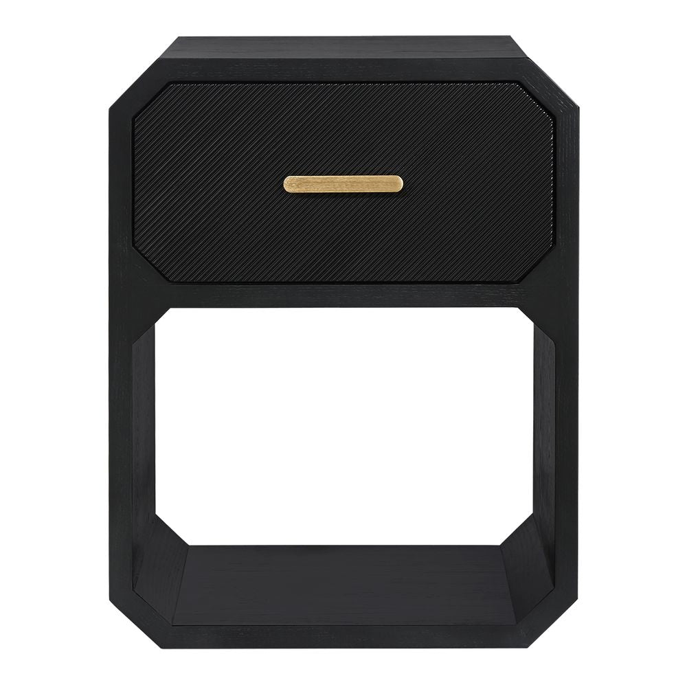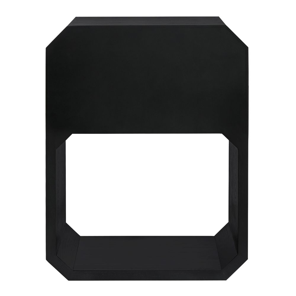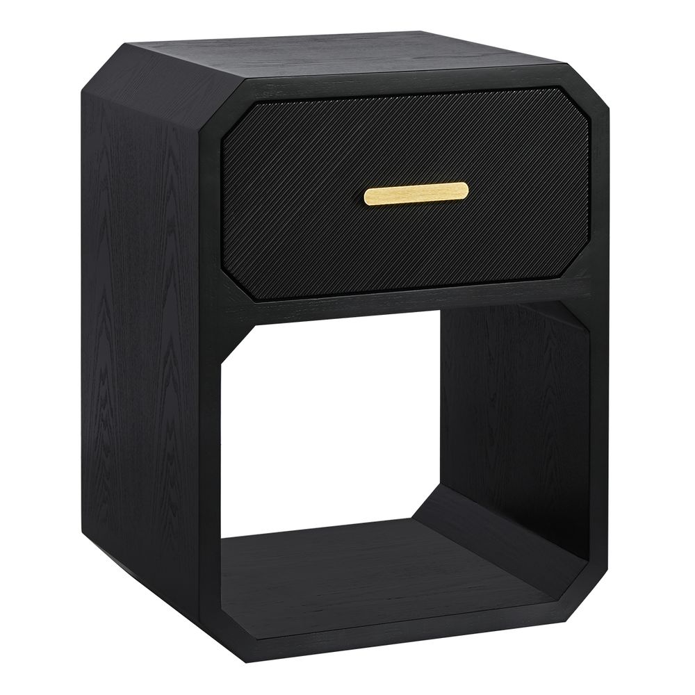 The Anderson Bedside Table – Small Black is designed to make a statement while serving everyday function. Crafted in ashwood veneer with a deep black painted finish, its angular frame measures 50cm wide, 40cm deep and 65cm high, striking the perfect balance of scale and proportion. A single drawer with subtle texturing glides effortlessly on metal runners, accented by a gleaming gold handle for contrast. The open base shelf enhances its architectural form, making this piece both practical and boldly refined. Also available in White and Antique Gold.