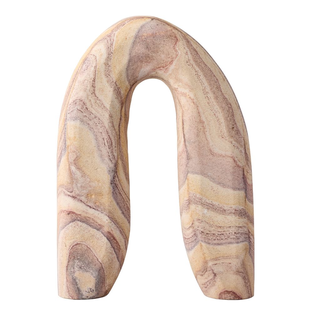 The Arch Marble Sculpture - Earth is a bold decorative accent crafted from solid rainbow stone marble with a smooth finish. Its curved, arch-like form brings organic movement and sculptural presence to any surface, from console tables to shelves. The natural tones of white, beige, and brown create a warm, earthy palette that complements both modern and rustic interiors. A striking standalone piece that adds depth and character to any space.