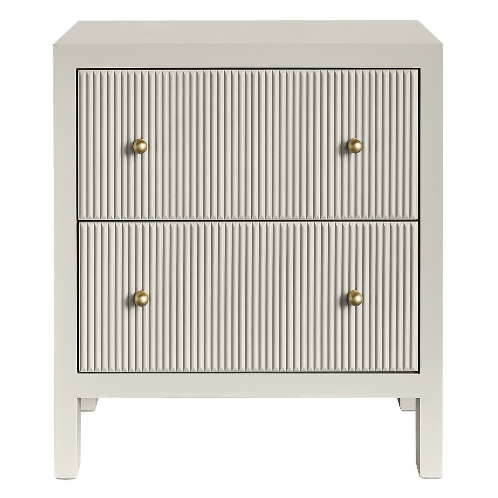 The Ariana Bedside Table in grey combines modern elegance with practical storage. Finished in a soft grey tone, its refined silhouette is elevated on slender legs for a light, contemporary presence. Two generously sized drawers with fluted detailing glide smoothly on metal runners, complemented by a gold knobs for a touch of luxury. Designed to balance timeless style with everyday function, the Ariana makes a versatile and sophisticated addition to the bedroom.