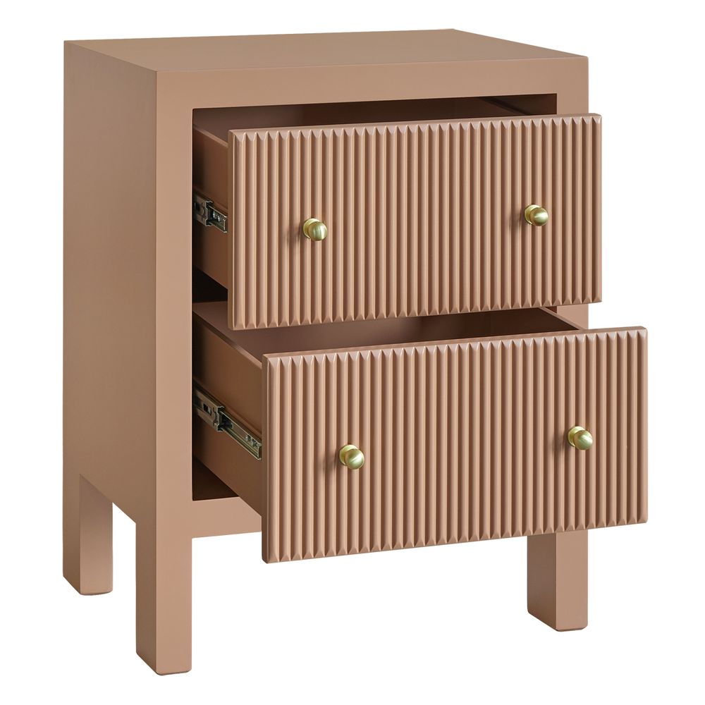 The Ariana Bedside Table Small Mocha Mousse evokes both luxury and warmth through its rich mocha tone — a hue aligned with Pantone’s 2025 Color of the Year, PANTONE 17-1230 Mocha Mousse, praised for its sensorial, grounding elegance. Its compact silhouette rests on slender legs for a light, elegant presence. Two drawers with vertical fluted detailing glide effortlessly on metal runners, crowned with delicate gold knobs for a subtle luxe accent. Ideal for smaller bedrooms, the Ariana merges timeless design with functional storage, making it a versatile and stylish addition to both modern and classic interiors.