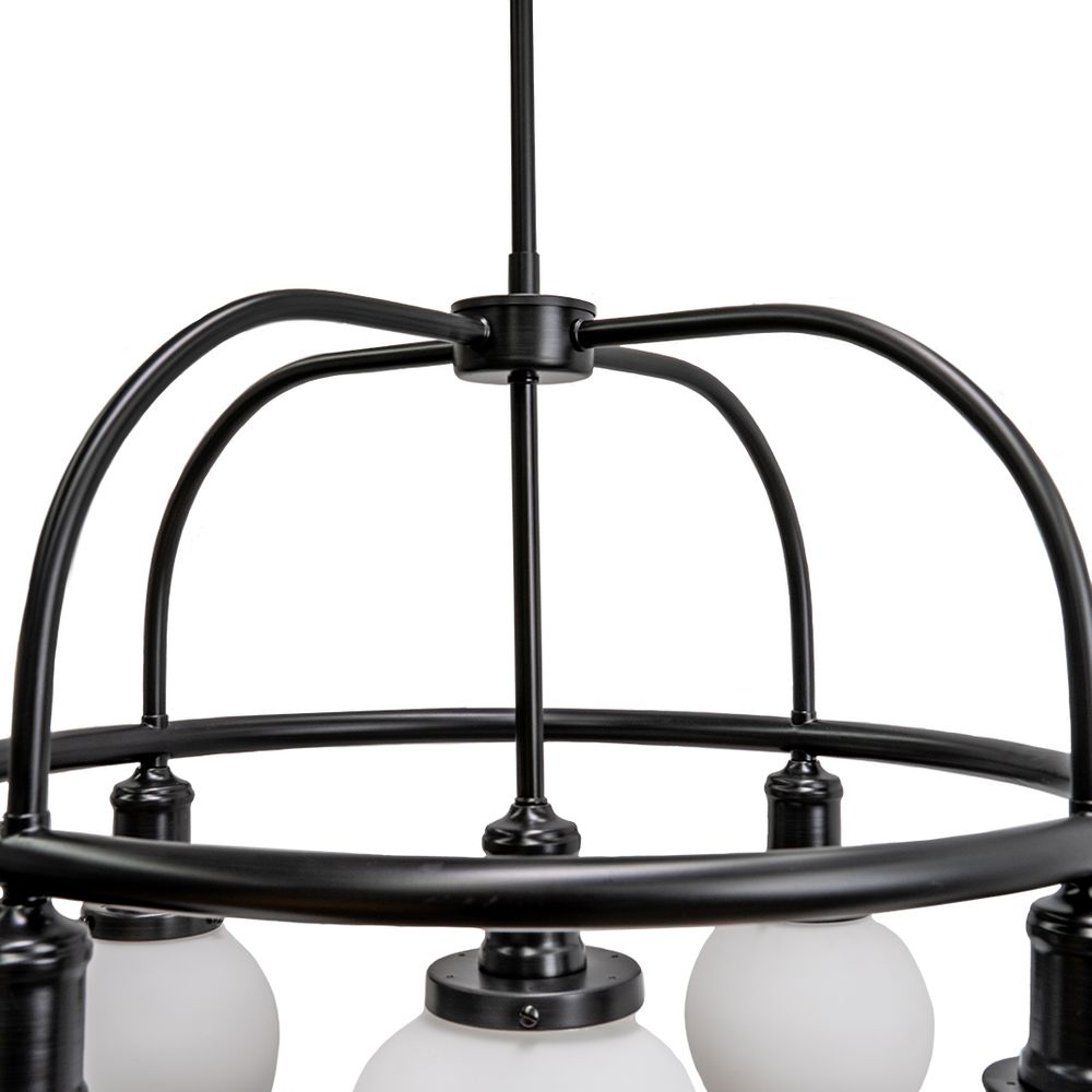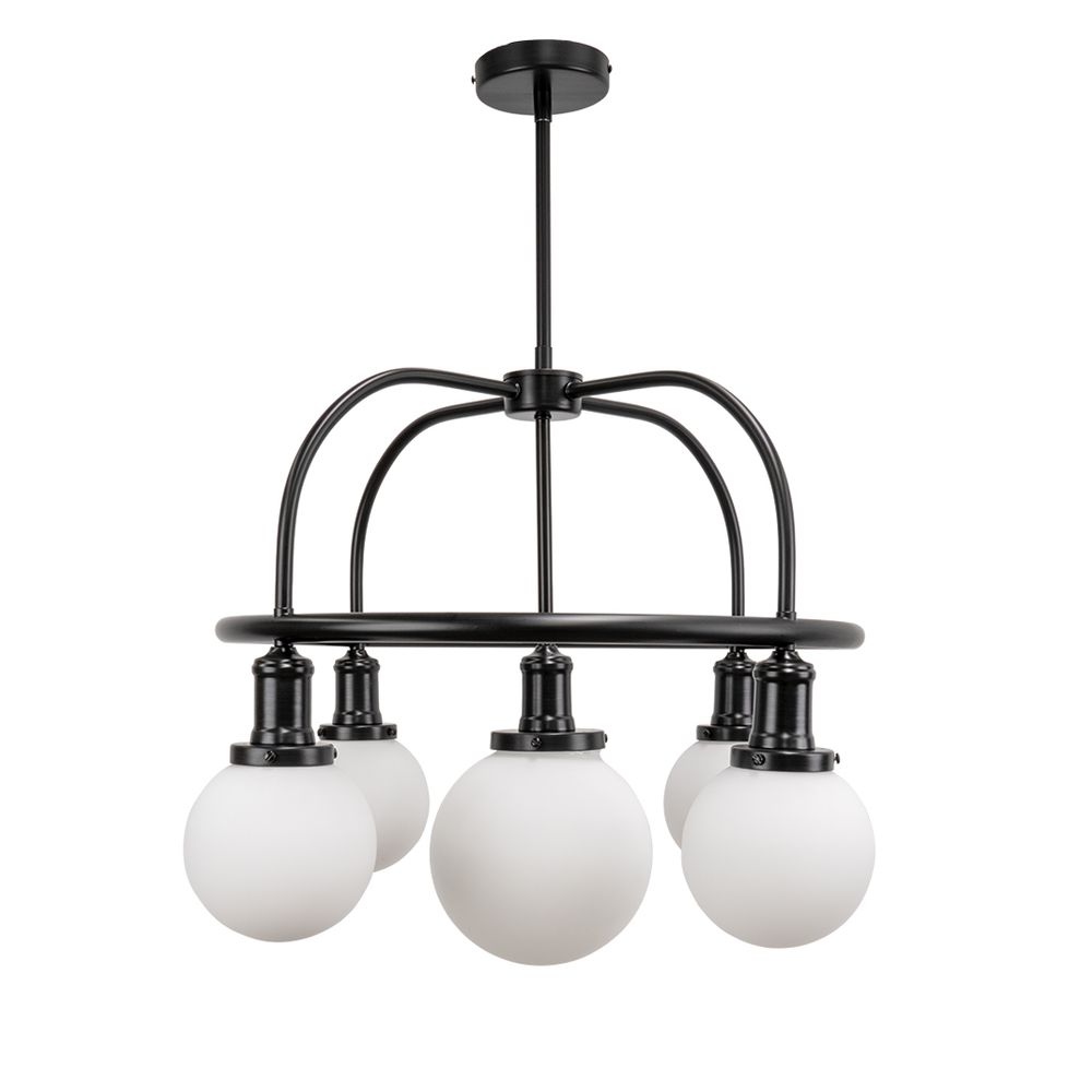 Featuring a cluster of glass milky spheres floating symmetrically beneath an elegant matt black iron ring and arms, the Bryant pendant references Mid-Century-Modern, industrial design and entices with its contemporary simplicity. Creating a sculptural statement, the Bryant pendant would be perfectly placed as a chic dining table centrepiece, creating a warm atmosphere with its gentle illumination.