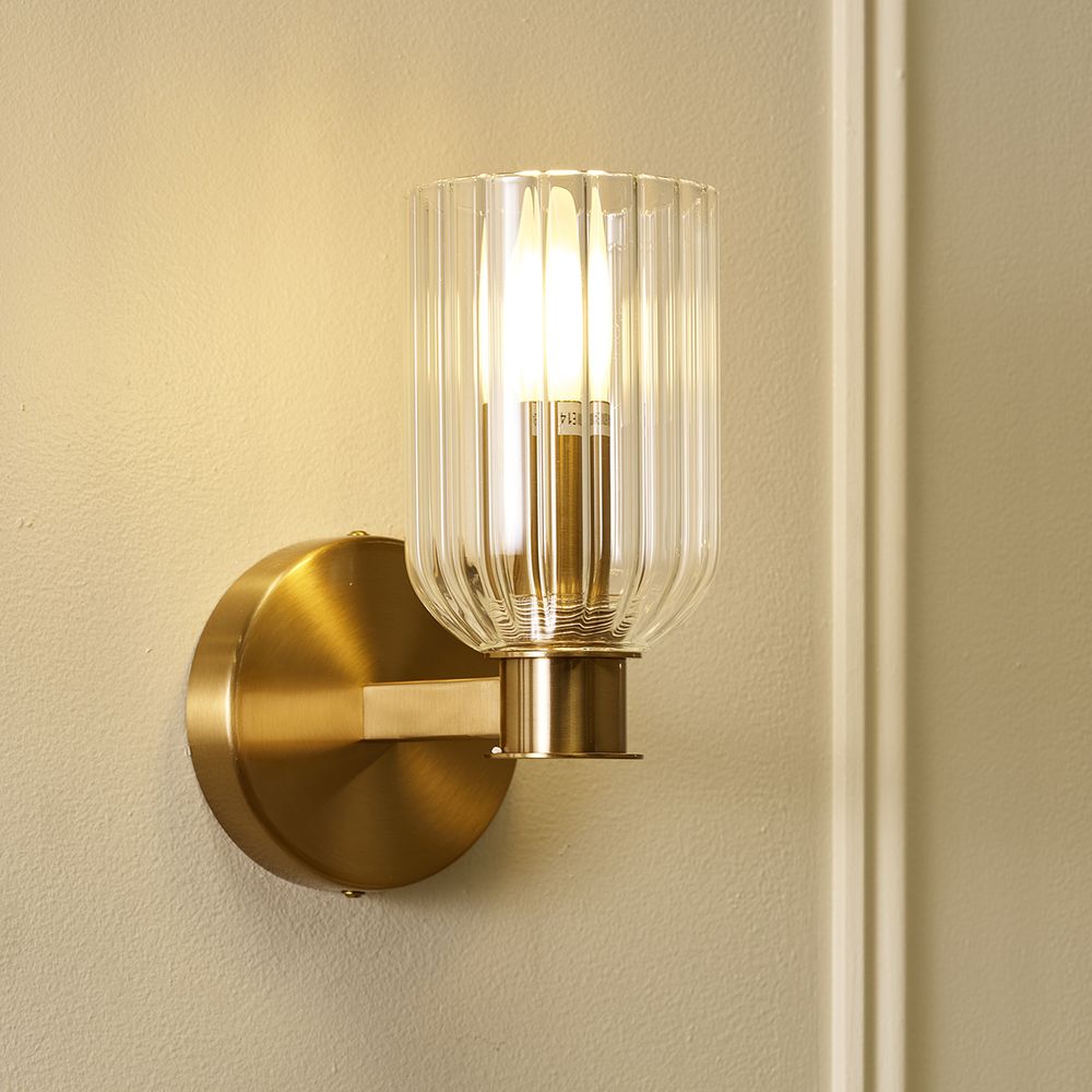 A seamless blend of vintage elegance and contemporary design, this wall sconce features a ribbed cylinder glass shade that diffuses light beautifully, adding texture and depth to any space. The cylindrical wall cup in a brushed brass finish with antique brass accents enhances its timeless appeal, making it a striking addition to hallways, bedrooms, or living areas. Designed for both functionality and style, this sophisticated fixture provides warm ambient lighting while complementing modern and classic interiors alike.