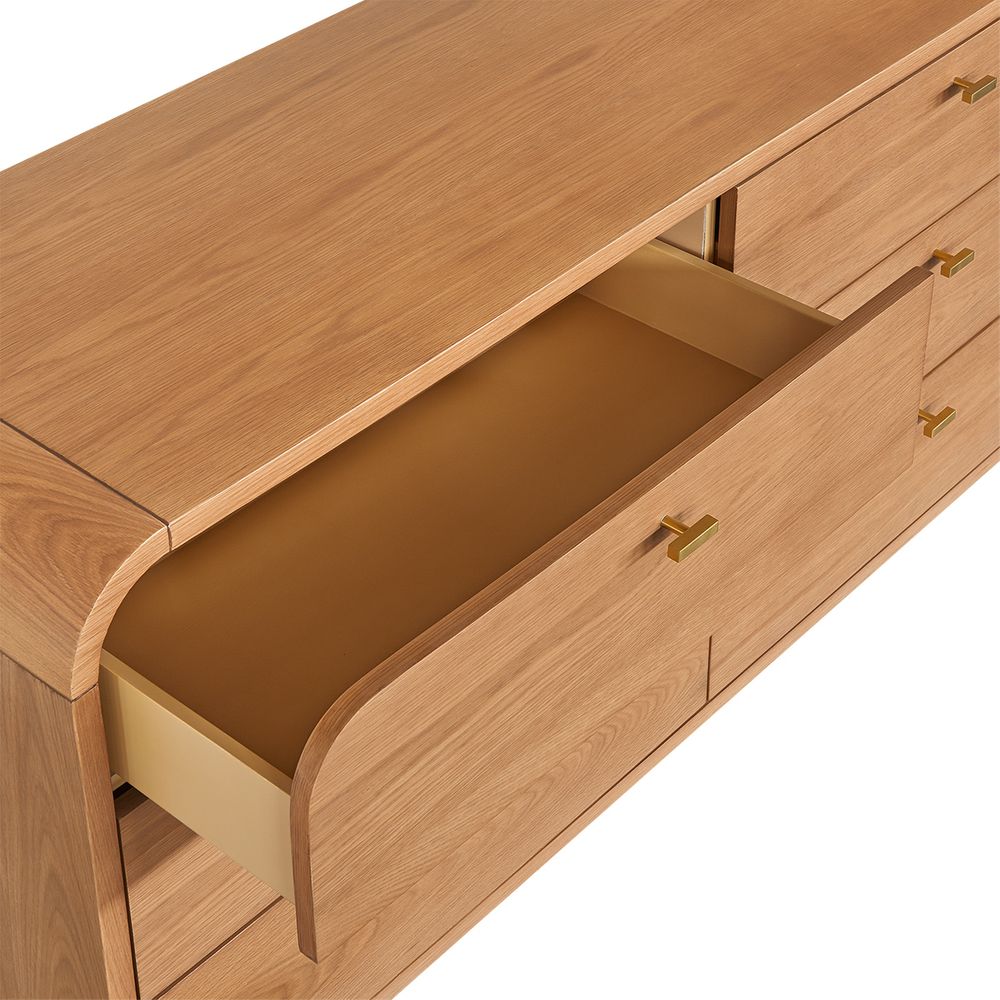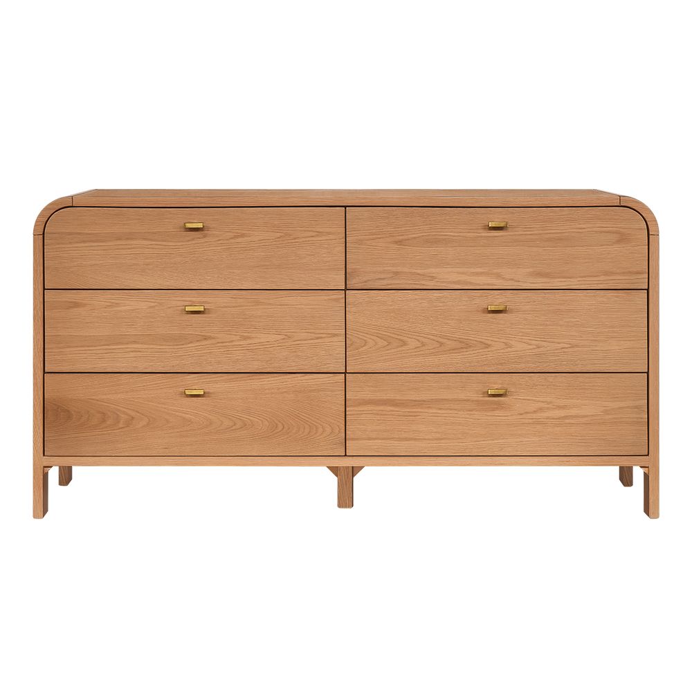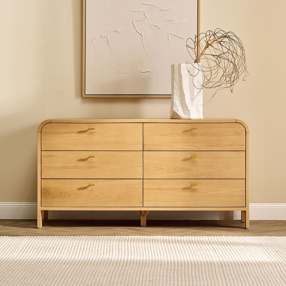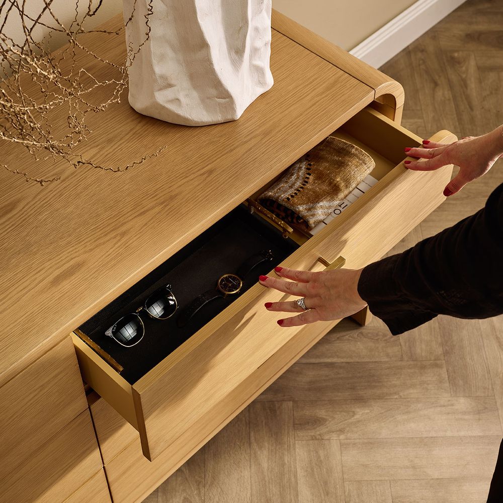 The Chisholm 6 Drawer Chest Natural Oak offers a refined take on functional storage with its soft curves and contemporary silhouette. Crafted in a warm oak veneer, this piece features six spacious drawers fitted with brushed gold T-bar handles and full-extend metal runners for smooth and reliable operation. The curved edges and elevated base create a sculptural presence, making it a timeless addition to both classic and modern interiors. Perfect for adding warmth and elegance to any space.