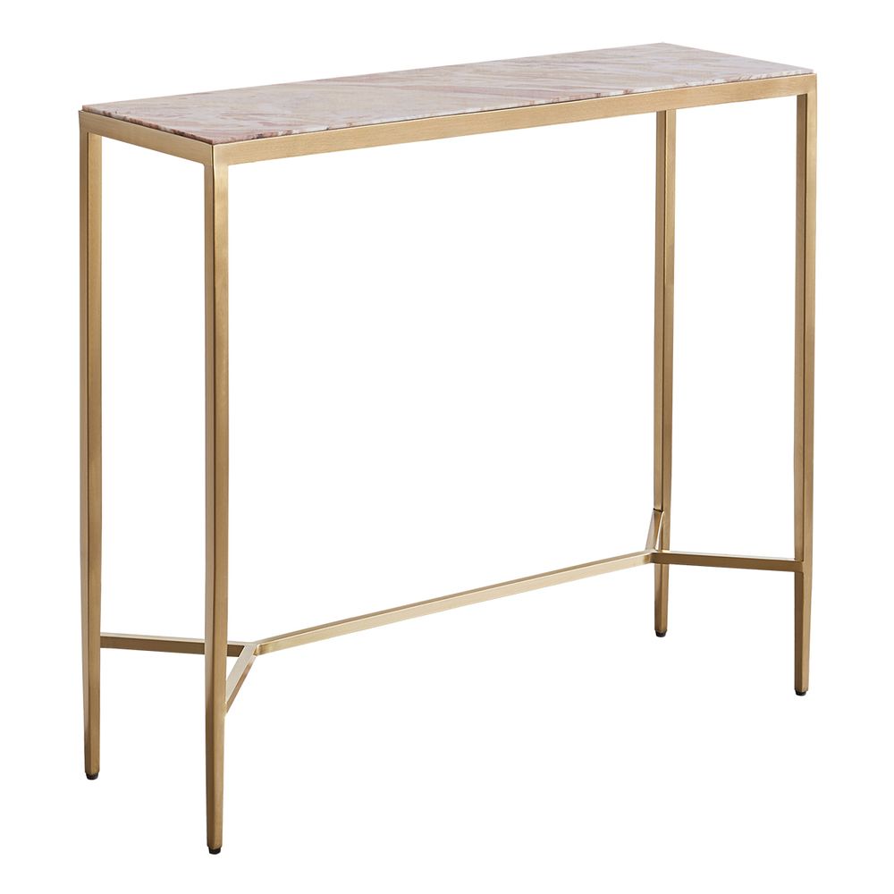 Grace your home with the quiet elegance of the Chloe Pink Marble Console Table in Gold. With its softly veined matte pink marble top and slim brushed gold stainless steel frame, this piece exudes refined sophistication. Designed to elevate hallways, entryways, or living rooms, its clean lines and airy profile offer timeless charm without overwhelming the space. Available in two versatile sizes and requiring no assembly, it’s a ready-to-style statement of effortless luxury.