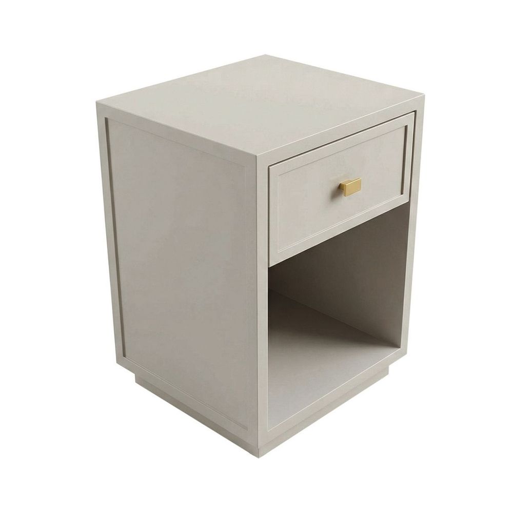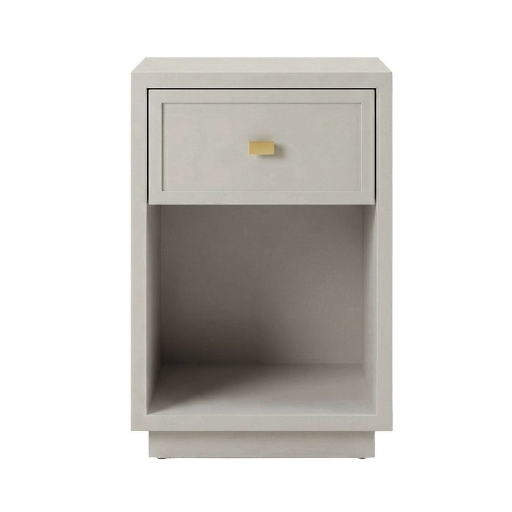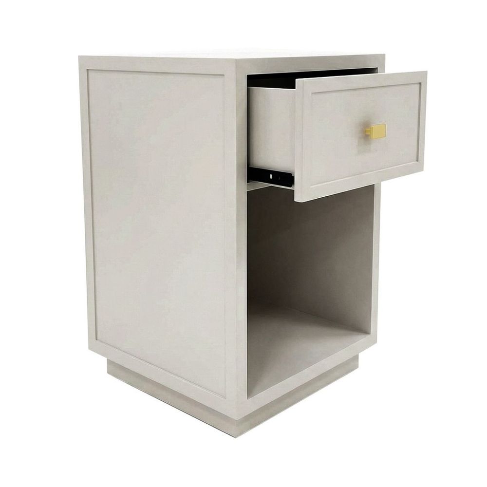 Elevate your bedroom with the Logan bedside table in soft grey. Its subtle shaker panelling and clean-edged silhouette are brought to life by a satin finish that adds depth and softness. Featuring a single drawer and open shelf, it balances practicality with polished design. Paired with a brushed gold handle, the Logan in grey blends seamlessly into modern and transitional spaces alike.