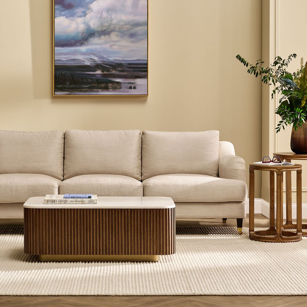 The Mason Rectangular Coffee Table pairs timeless craftsmanship with modern elegance. Topped with luxurious Sivec marble, rich in natural veining, it rests on a fluted oak wood base finished in warm walnut, complemented by a sleek metal gold plinth. Its elongated form offers generous surface space while adding refined texture and contrast. Ideal for contemporary or classic interiors, this piece balances sophistication and functionality, creating a focal point of enduring beauty in any living space.