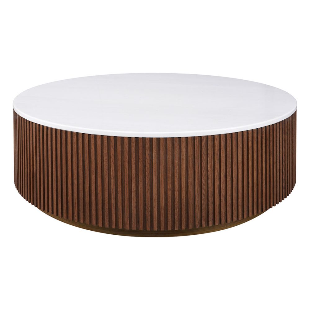 The Mason Round Coffee Table showcases timeless craftsmanship with a contemporary edge. Featuring a luxurious Sivec marble top with natural veining, it is set on a fluted oak wood base in a warm walnut finish, accented by a sleek metal gold plinth. Its round silhouette adds softness and balance to any space. Available in large and medium sizes, this piece offers versatile elegance, combining refined design with practical functionality for modern and classic interiors alike.
