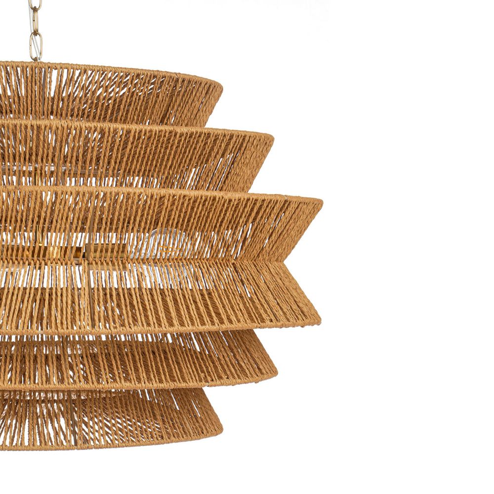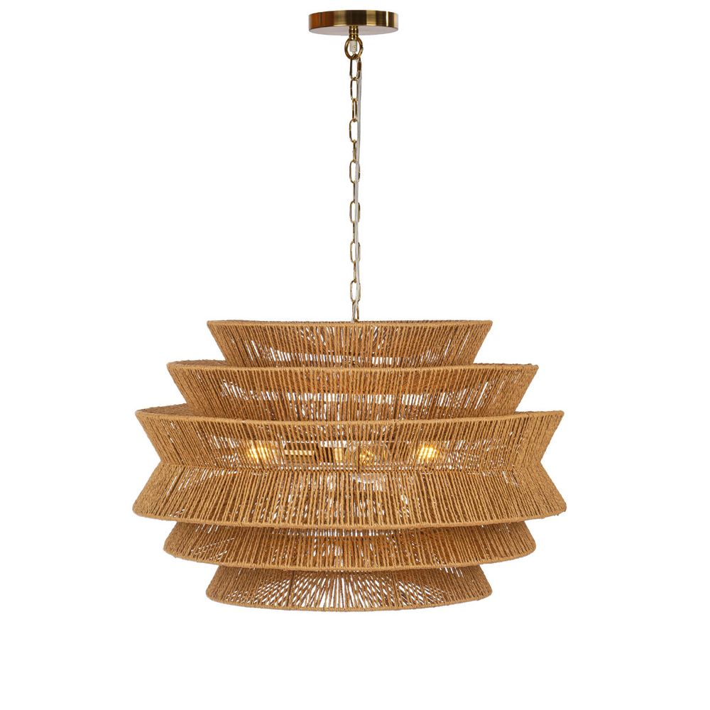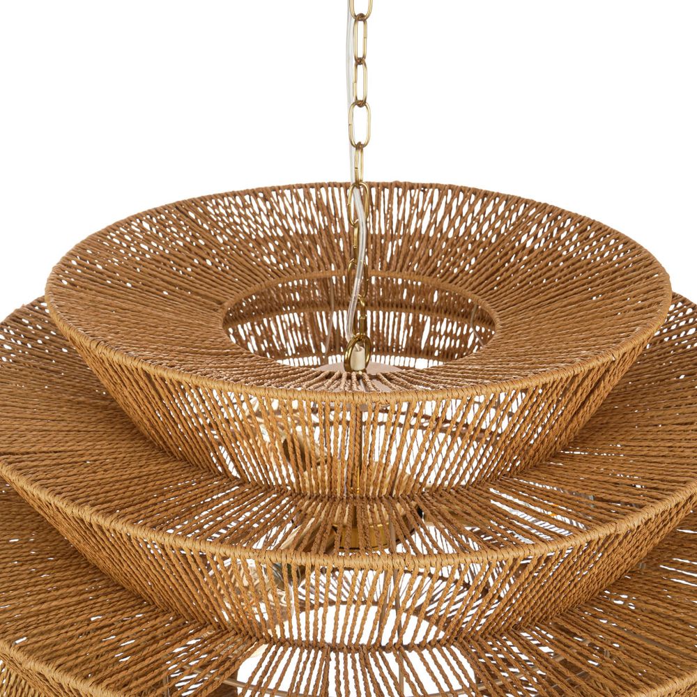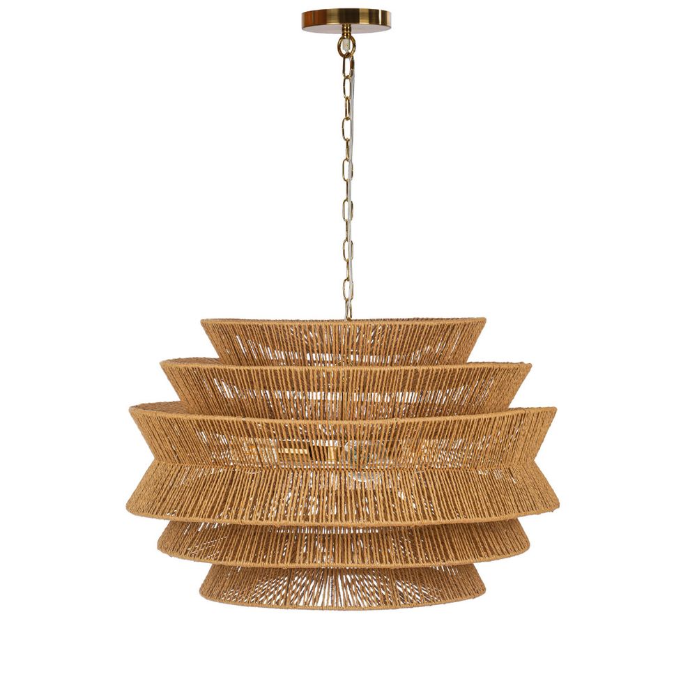 The Montevideo Pendant is a stunning fusion of sculptural form and natural texture. Featuring handwoven paper rope intricately wrapped around a cascading iron frame, this layered pendant brings an organic elegance to contemporary spaces. Its warm, earthy tones are complemented by a brass-coloured chain and fittings, adding a sophisticated touch. Perfect for creating a striking focal point, Montevideo is ideal for dining rooms, entryways, or commercial interiors seeking refined natural charm.