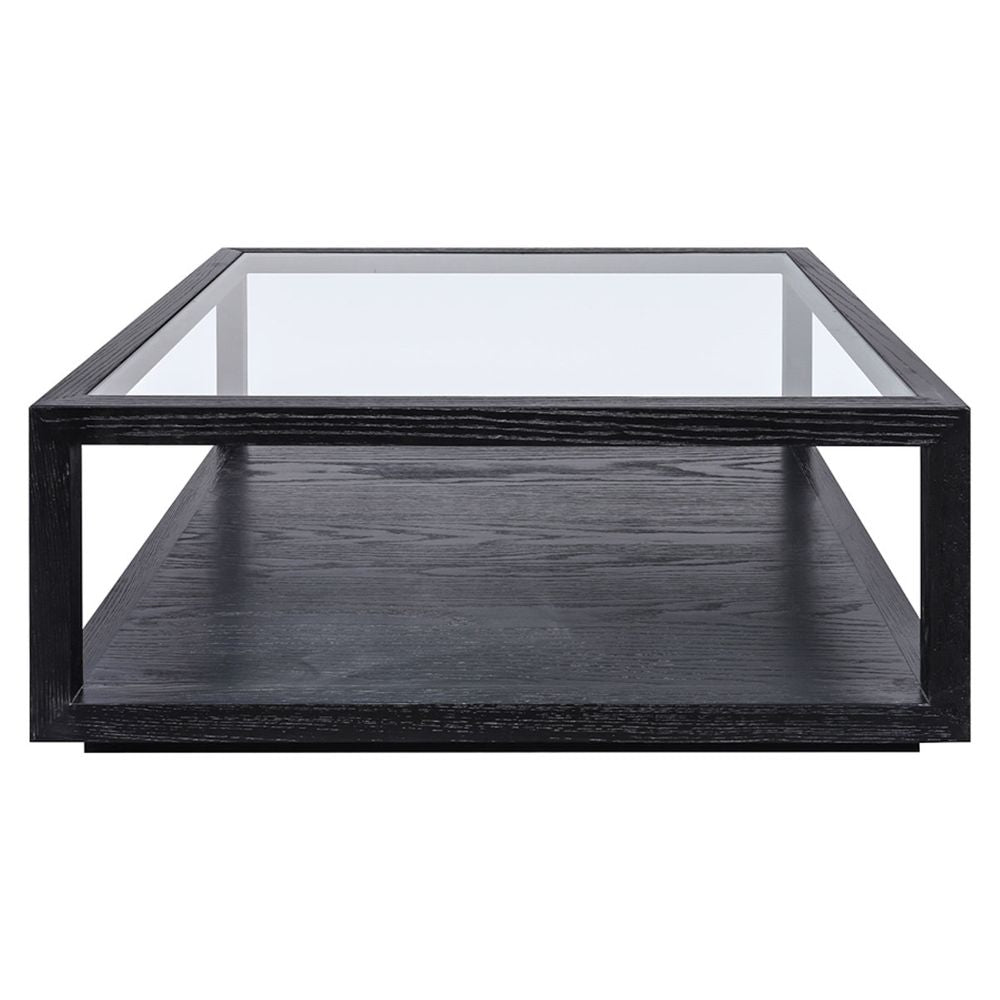 The Sadie Collection showcases a perfect balance of brushed oak wood and sleek tempered glass, designed to bring effortless sophistication to modern and classic interiors. Bringing this refined aesthetic into focus, Sadie Square Coffee Table features a brushed oak frame in a deep black finish, creating a striking contrast against its crystal-clear tempered glass top. Designed for both style and functionality, the lower shelf offers additional space for storage or curated displays, making it an elegant yet practical centrepiece. Its minimalist silhouette integrates seamlessly into curated interiors, enhancing any living space with a touch of timeless sophistication.