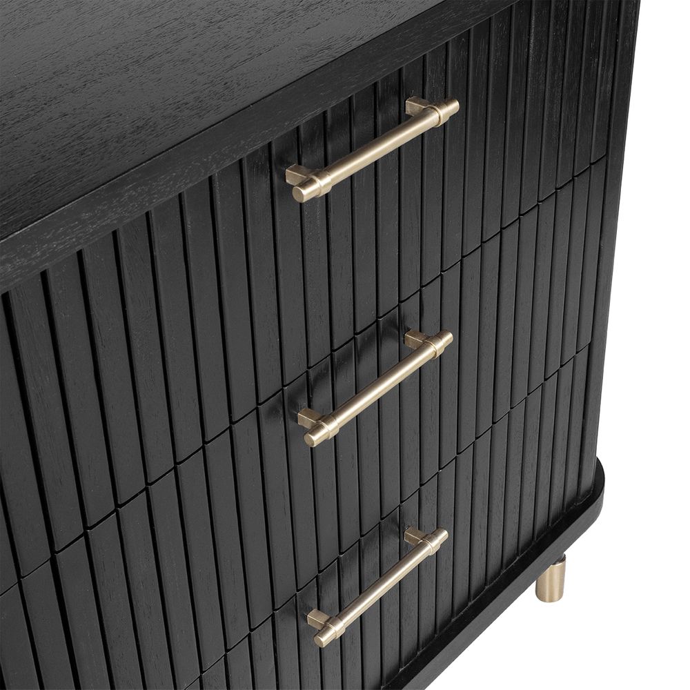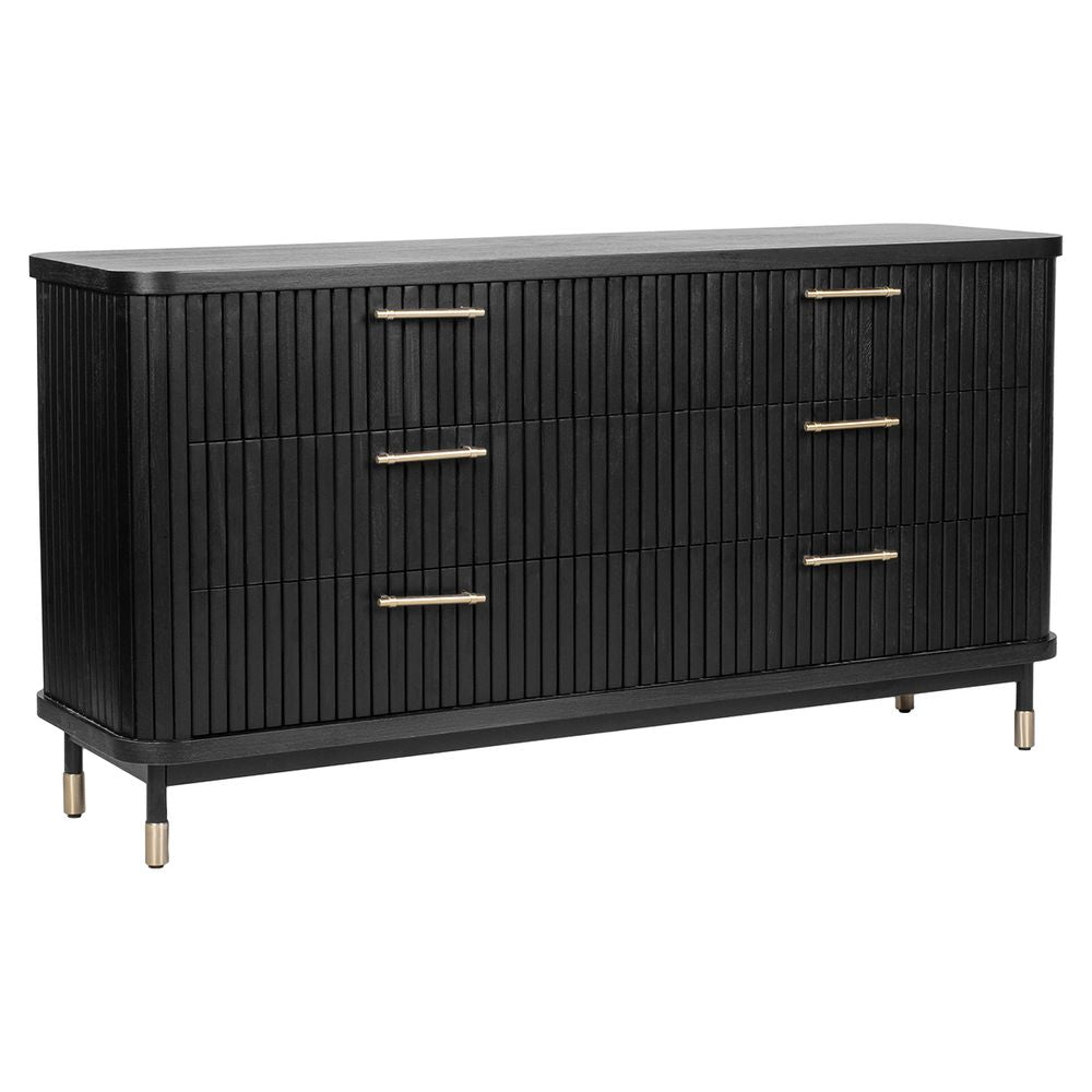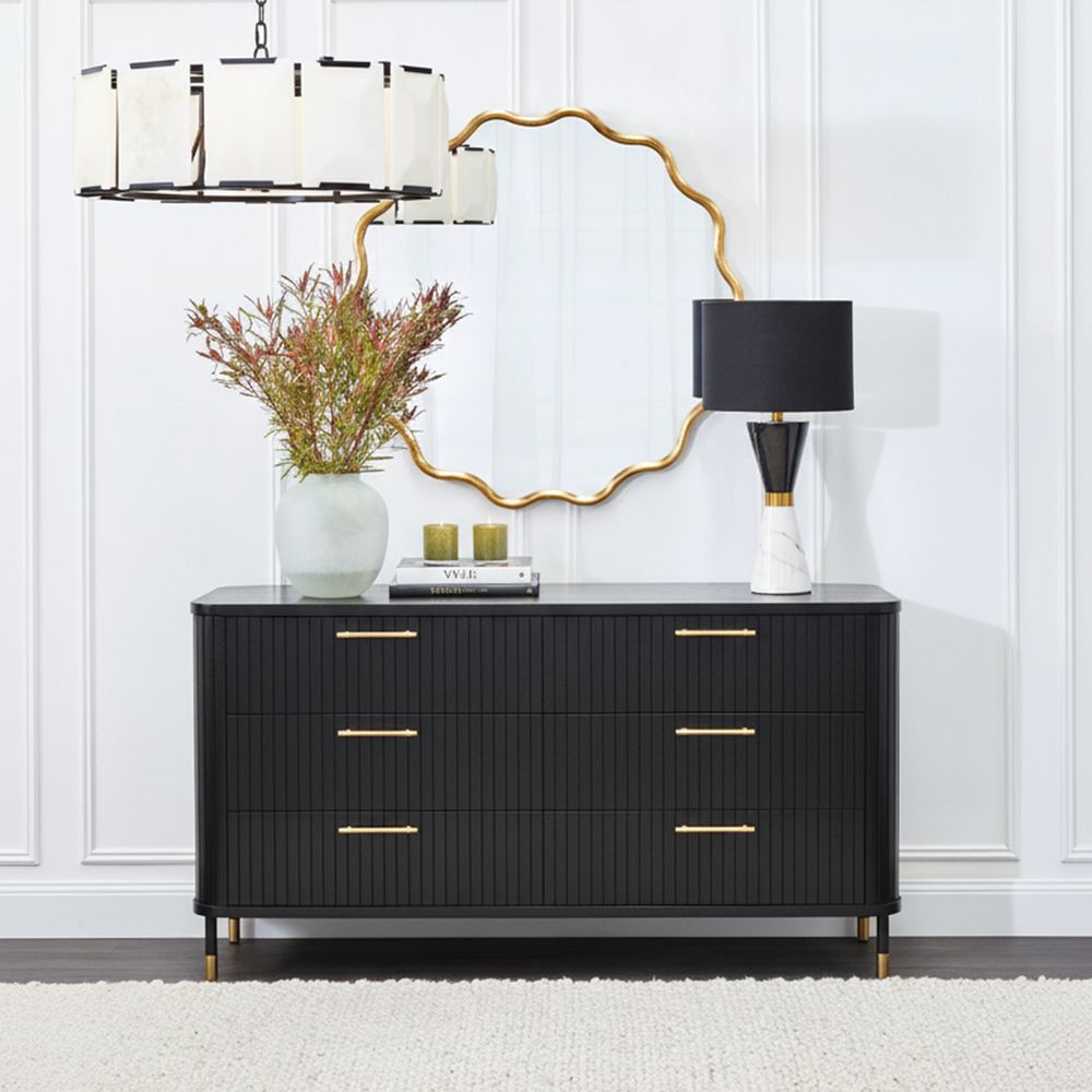 The Sophia 6 Drawer Chest in Black brings timeless sophistication with a bold modern edge. Designed with vertical ribbed panelling, soft curved corners and brushed brass handles, this piece delivers architectural detail that elevates any interior. Generous storage is provided across six spacious drawers, set on smooth runners for everyday ease. Slimline legs finished with brass-capped detail add a touch of luxury, while the deep black finish enhances its dramatic appeal. Perfect for contemporary, modern, and boutique interiors, the Sophia Chest is also available in White and Natural Oak.