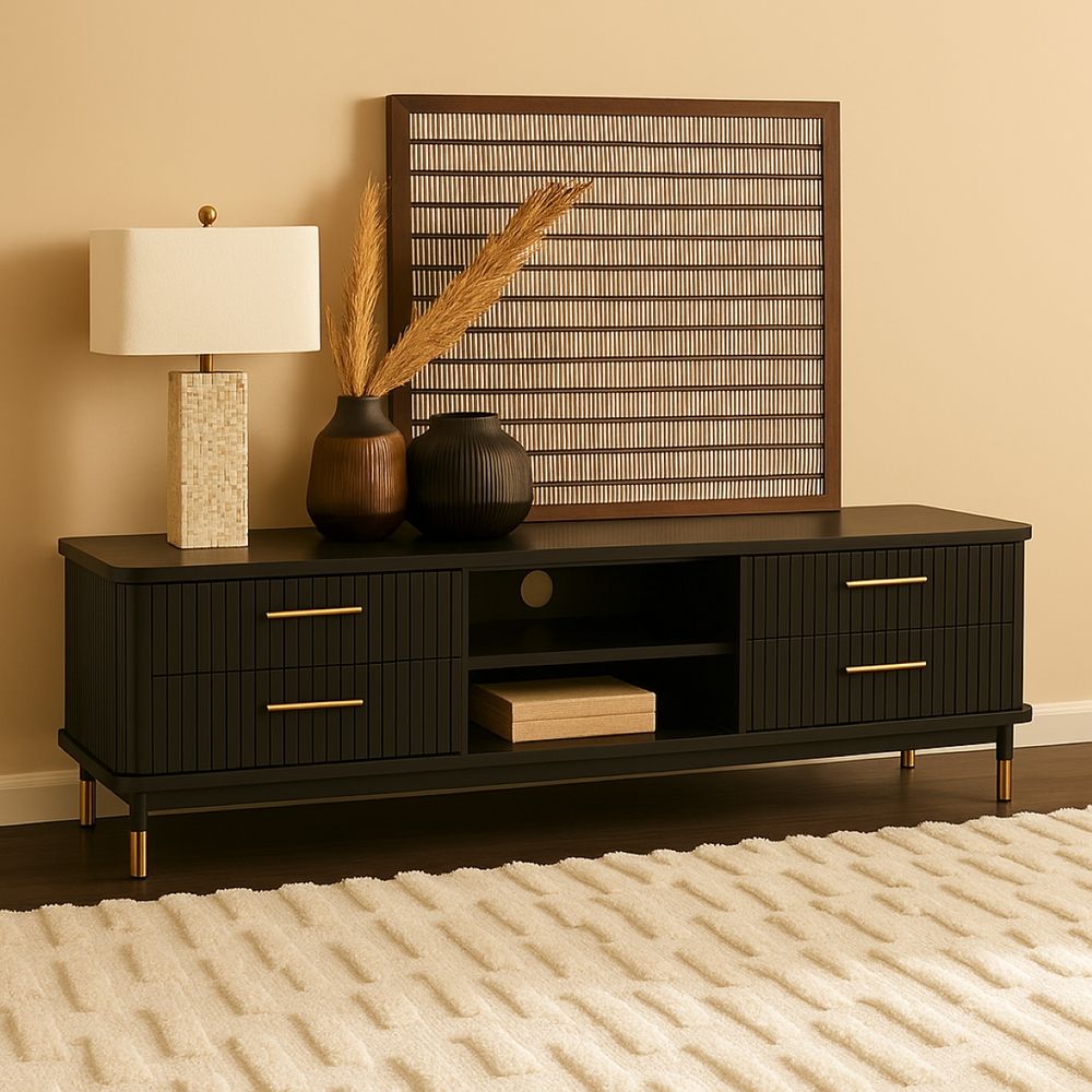 The Sophia Entertainment Unit blends practical storage with contemporary elegance, making it a standout piece for modern living spaces. Designed with fluted drawer fronts, slim gold handles, and brass-capped legs, it adds architectural detail and sophistication. Four spacious drawers and two open shelves provide ample storage for media equipment, consoles, and accessories, while a rear cable hole with matching grommet keeps cords neatly concealed. Available in versatile finishes including White, Black, and Oak Natural, the Sophia Entertainment Unit complements a wide range of interior styles.