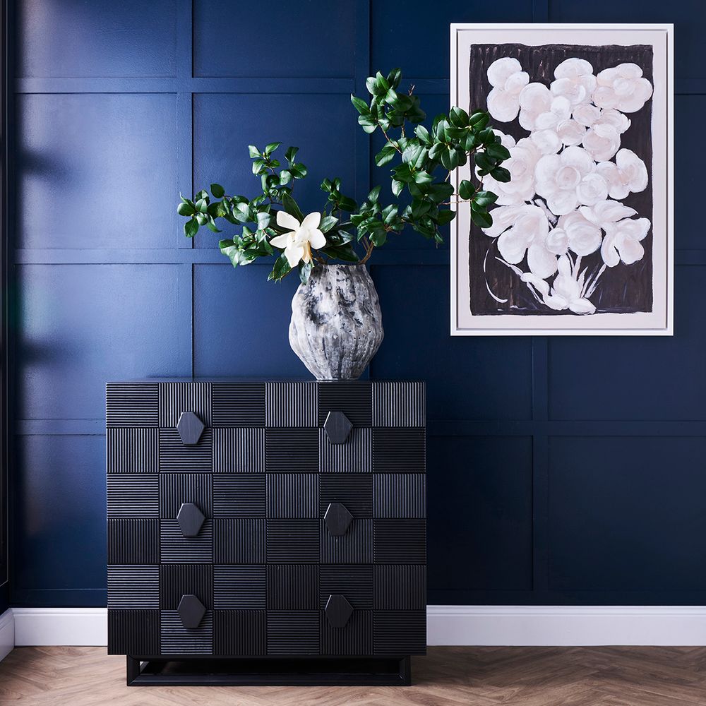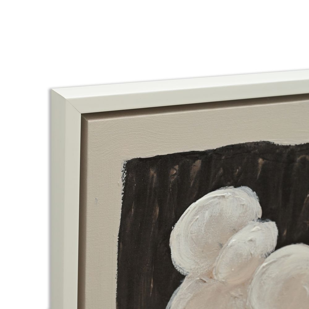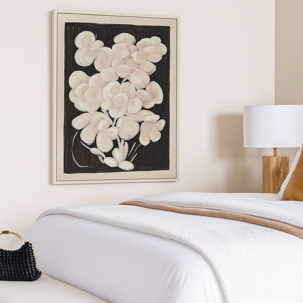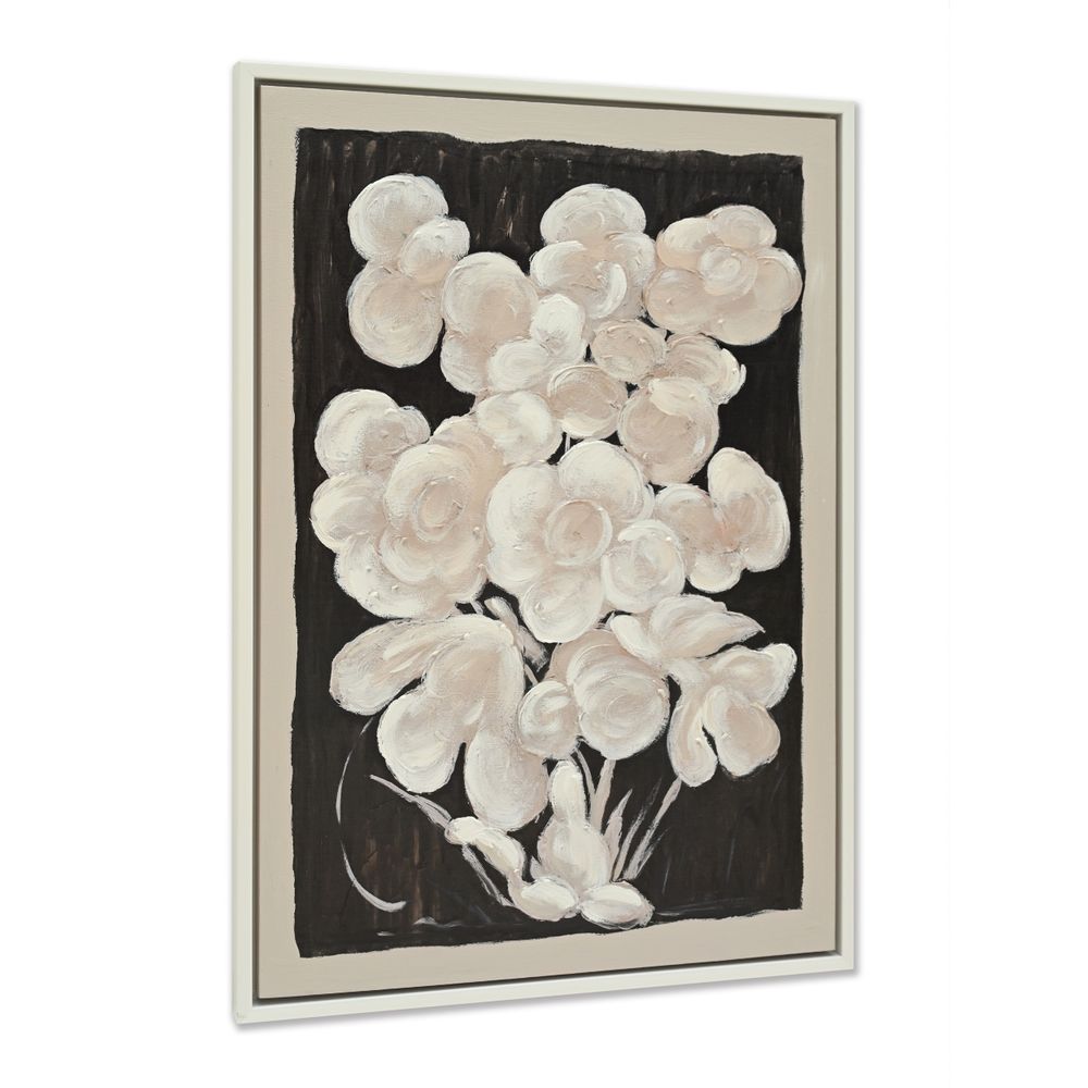 The Textured Bouquet Enhanced Canvas Print brings timeless elegance to any setting with its bold contrast and delicate detailing. A soft cluster of white blooms emerges from a striking black background, revealing a tactile, layered finish that enhances its visual depth. Expertly handcrafted on high-quality framed cotton canvas, each piece offers subtle variations, making every artwork a unique expression. A refined decorative statement, this print is ideal for interiors seeking graceful form and artistic texture.