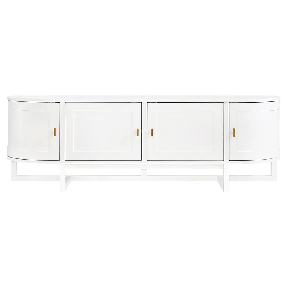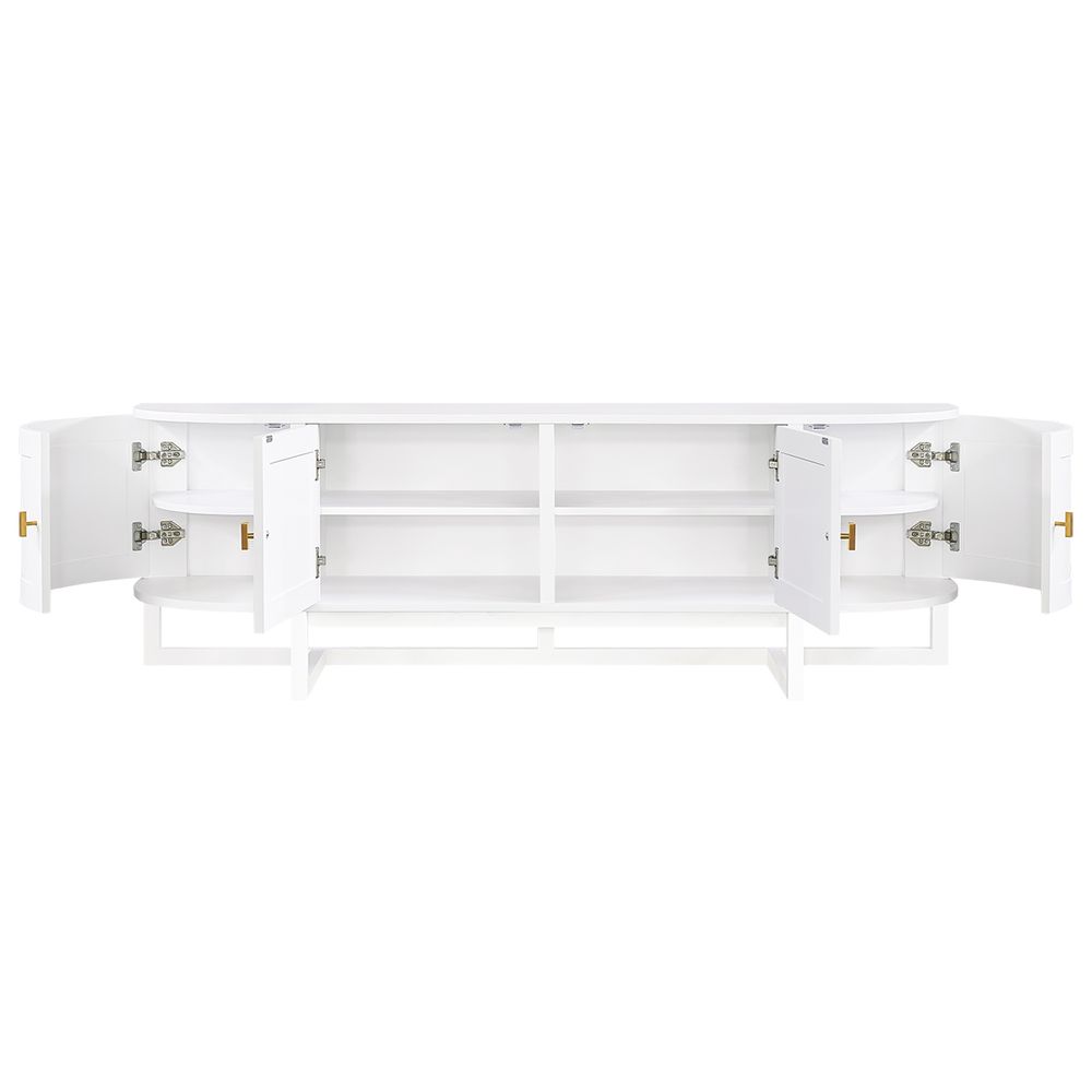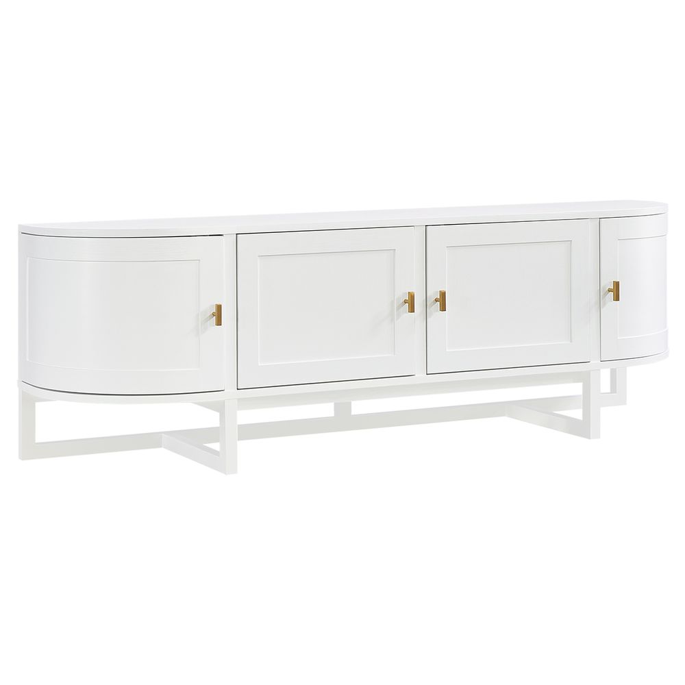 The Theodore range expands with the introduction of the Theodore Entertainment Unit – a seamless blend of function and form. Echoing the signature demilune silhouette and refined craftsmanship of the collection, this piece offers ample storage while elevating living spaces with its sculptural charm. A perfect match for the Lusitano recliner, it enhances modern dining, living rooms, or entryways. Crafted from grained oak veneer in white, it features a curved silhouette on a sleek interlocking base with brushed gold hardware. It includes four doors, one fixed shelf per section, and two drawers with shaker detail. Built for durability, its 160cm length provides generous storage with a minimalist aesthetic. Available in both black and white, this elegant design complements a variety of interior styles with timeless appeal.