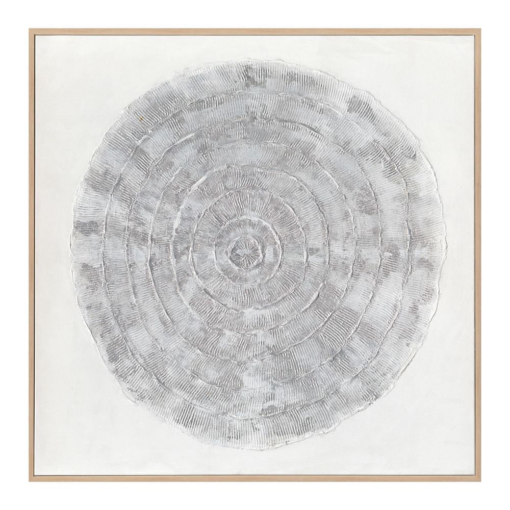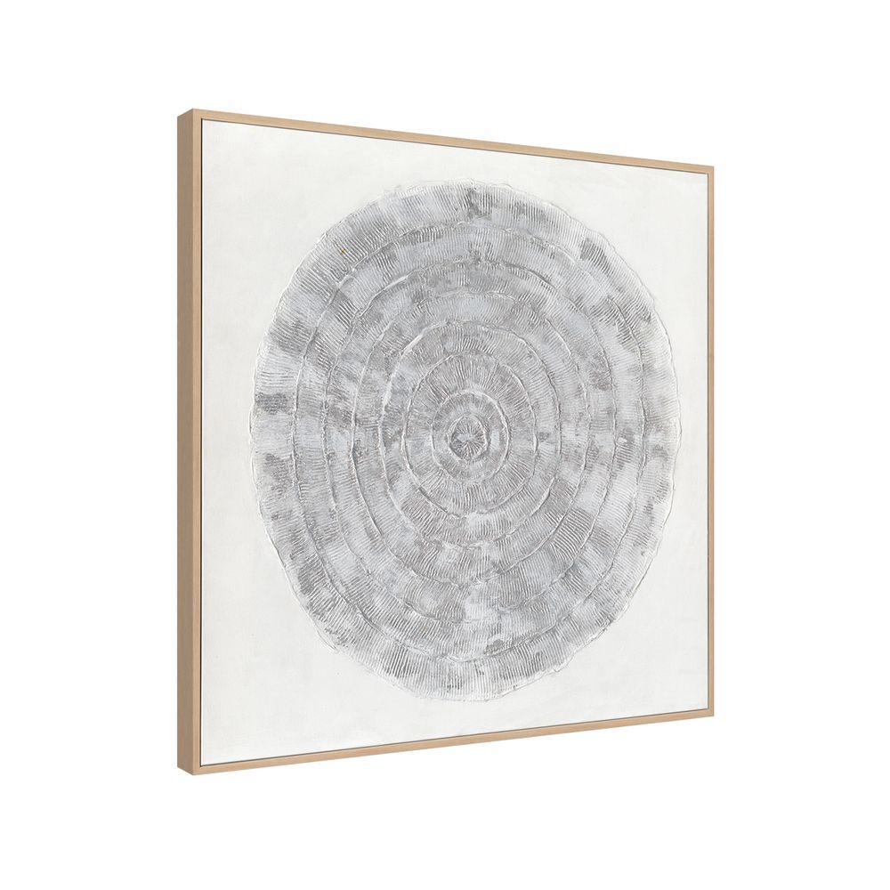 Celebrate organic form and minimalist expression with the Untouched Canvas Painting. Featuring a striking concentric motif reminiscent of natural tree rings, this 100% hand-painted acrylic piece brings subtle depth and texture to contemporary spaces. Rendered in layered neutrals with silvery grey accents, its raised surface and calming palette evoke quiet strength and meditative stillness. Set in a refined timber frame, this artwork is perfect for anchoring serene interiors or adding tactile interest to gallery walls.