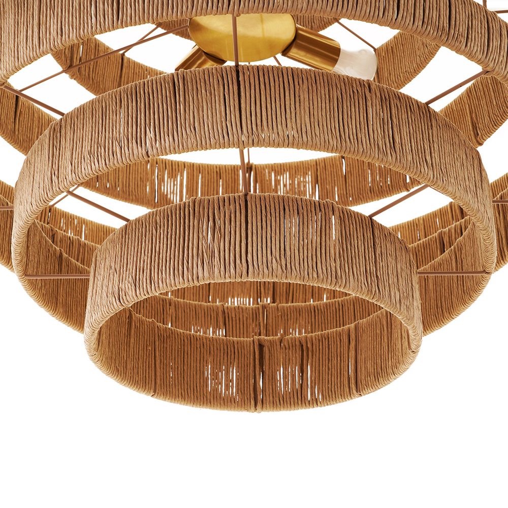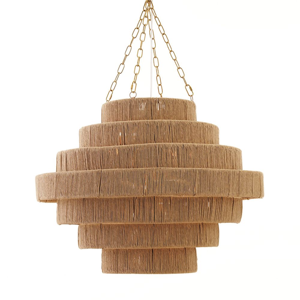 An unobtrusive beauty, the sizeable Vilano wide pendant features a paper rope hand woven around a 7 tiered iron frame infusing modern interiors with organic warmth. Referencing a trend towards natural interiors, the woven rope creates an alluring texture while the tiered structure makes for striking sculptural form. Finished with an elegant brass coloured chain and fittings for a touch of modern luxe, the Vilano rope wide 7 tier pendant creates a stunning centrepiece for use in any domestic or commercial setting.