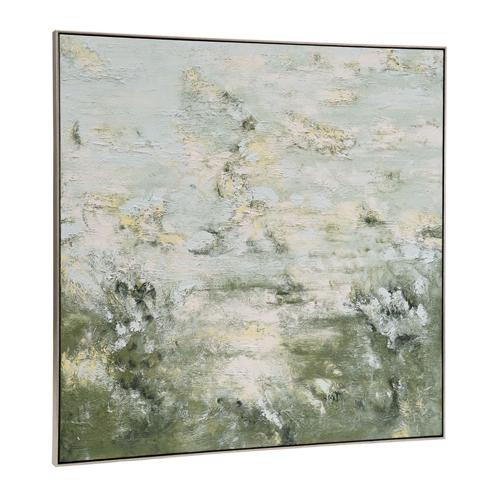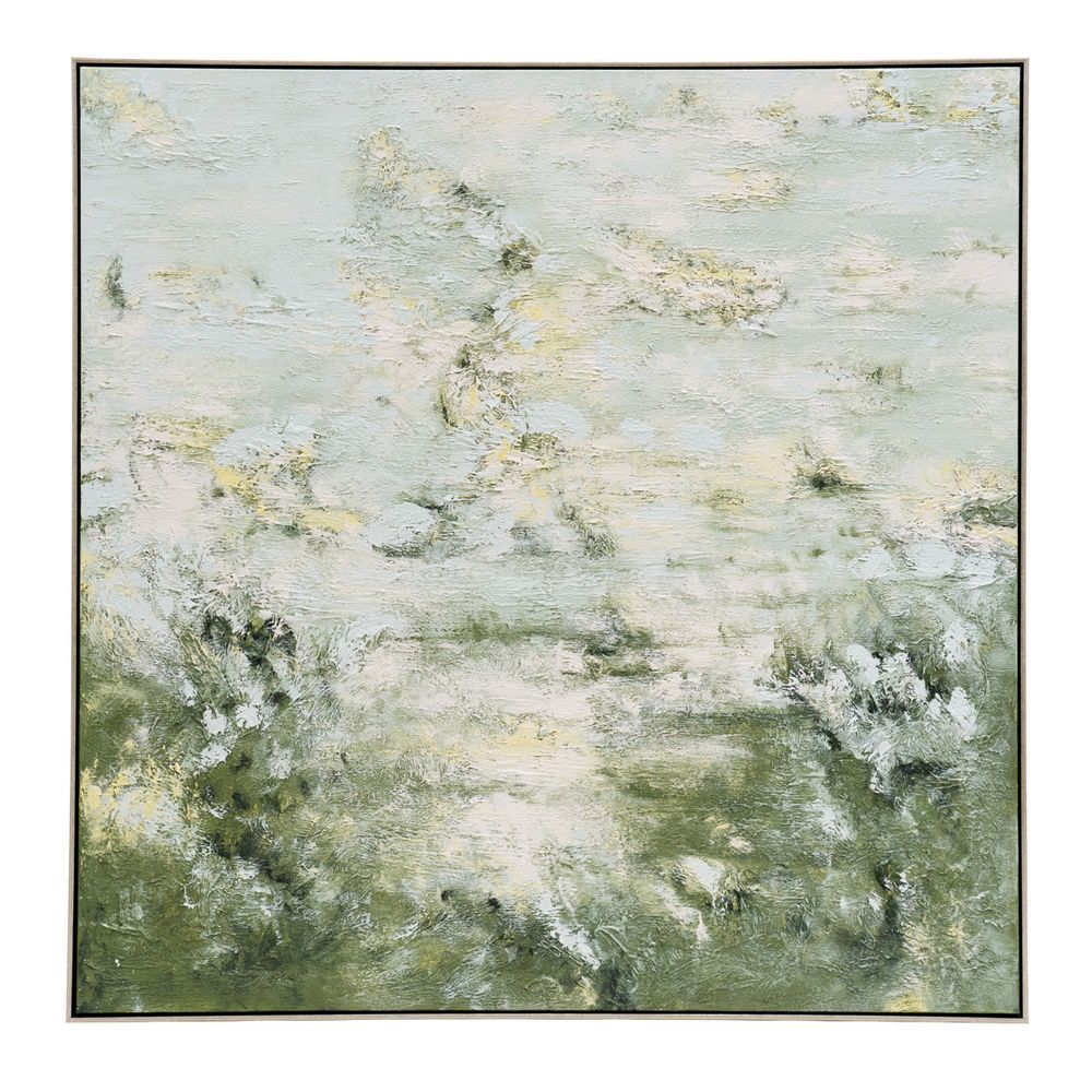 A soothing impressionist style art piece, Whimsical Meadow oil on canvas painting is inspired by the fresh tones and textures of a lush open field. Delicate yellow wildflowers burst forth offering complimentary tone to this whimsical landscape. Resonating with a mood of tranquillity and renewal, comforting hues and detailed brush strokes create a sense of nature’s beauty. Expertly painted in oil and mounted in an elegant antique silver shadow box frame, at 140cm square.