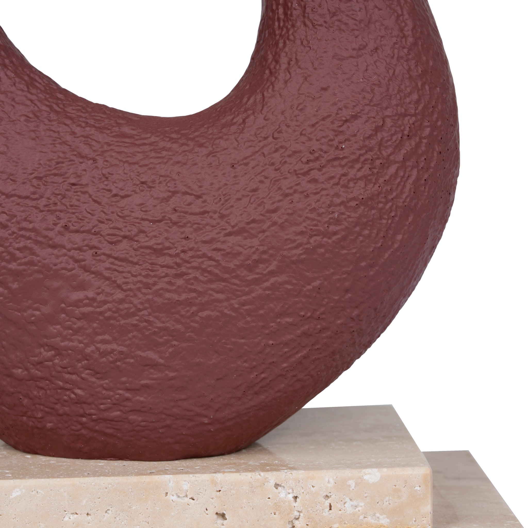 Resin sculpture with a textured organic form Two-tier travertine base with warm maroon veining Hollowed centre creates a light, airy silhouette Neutral tones for versatile styling Weighty base ensures balance and durability Ideal as a standalone or paired accent Product comes fully assembled Note: Our marble and travertine decor pieces are natural stone that each has its own unique imperfections and characteristics. Any variations in colour, texture, polish, and pattern are not a fault and should be appreciated. Please note that polished marble and travertine are porous, so contact with liquids or hot beverages may cause the marble to mark. Make sure to wipe away any contact with food or drink immediately using water or a mild cleaner.