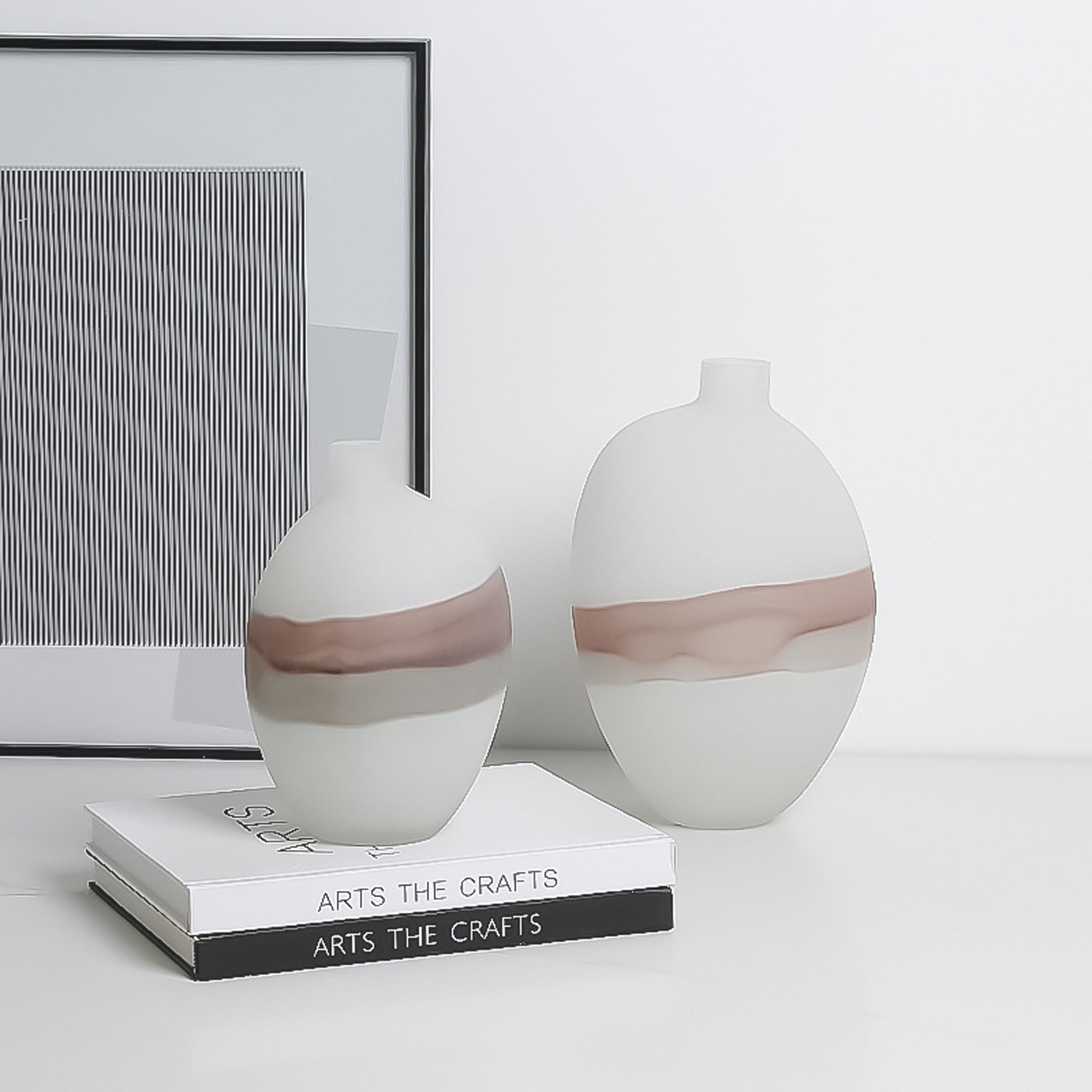 Premium glass finish Oval silhouette with a narrow neck White base accented with flowing bands of blush pink and taupe tones Subtle gradient effect Minimalist yet eye-catching Versatile design works as a standalone statement piece Lightweight yet sturdy, ideal for styling on shelves, mantels, or tables Product comes fully assembled