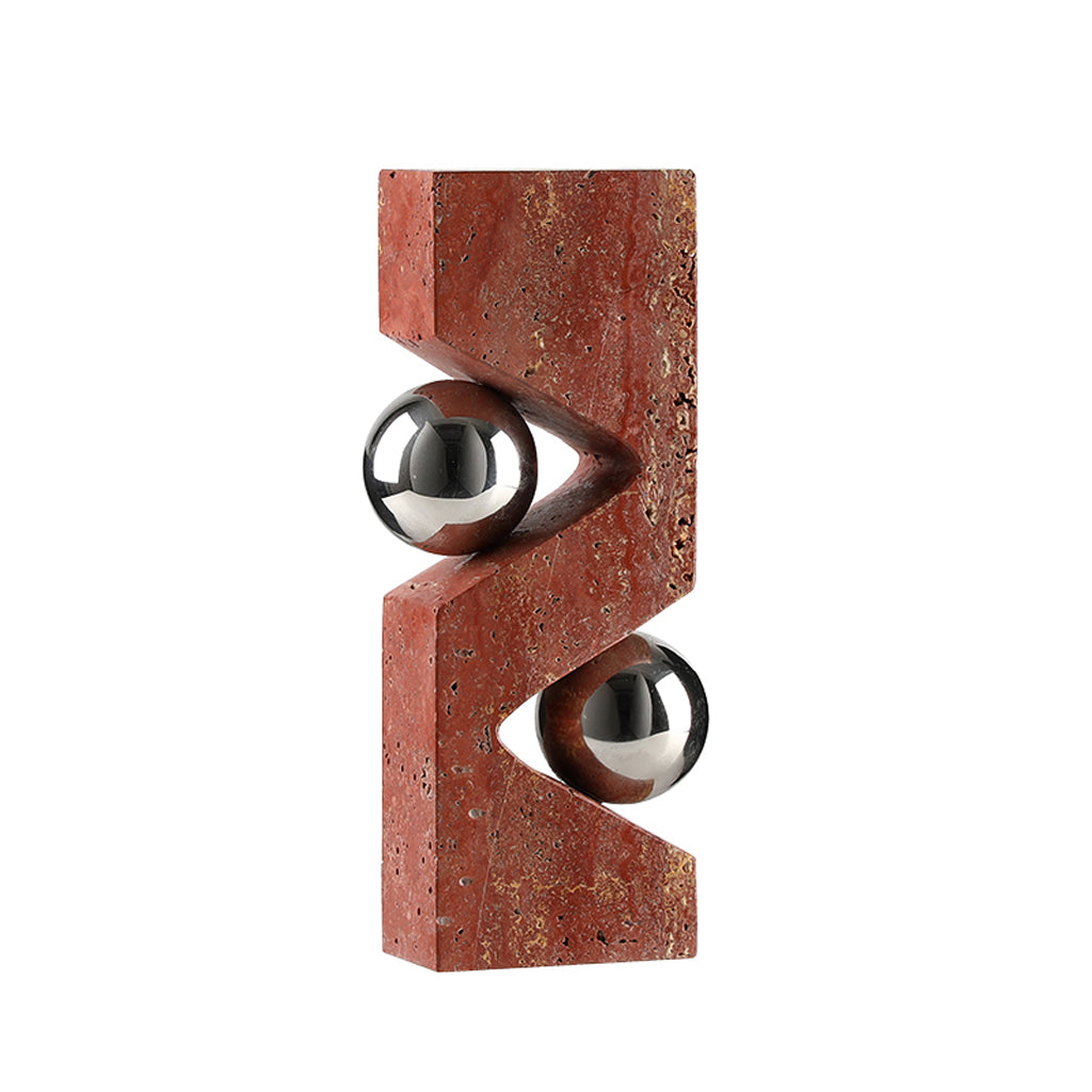 Premium natural marble Accented with polished metallic spheres Unique marble grain and natural variations Bold geometric silhouette with angular cut-outs Rich terracotta-red hue Reflective steel-like spheres Designed as a sculptural statement décor piece Product comes fully assembled