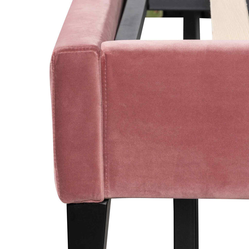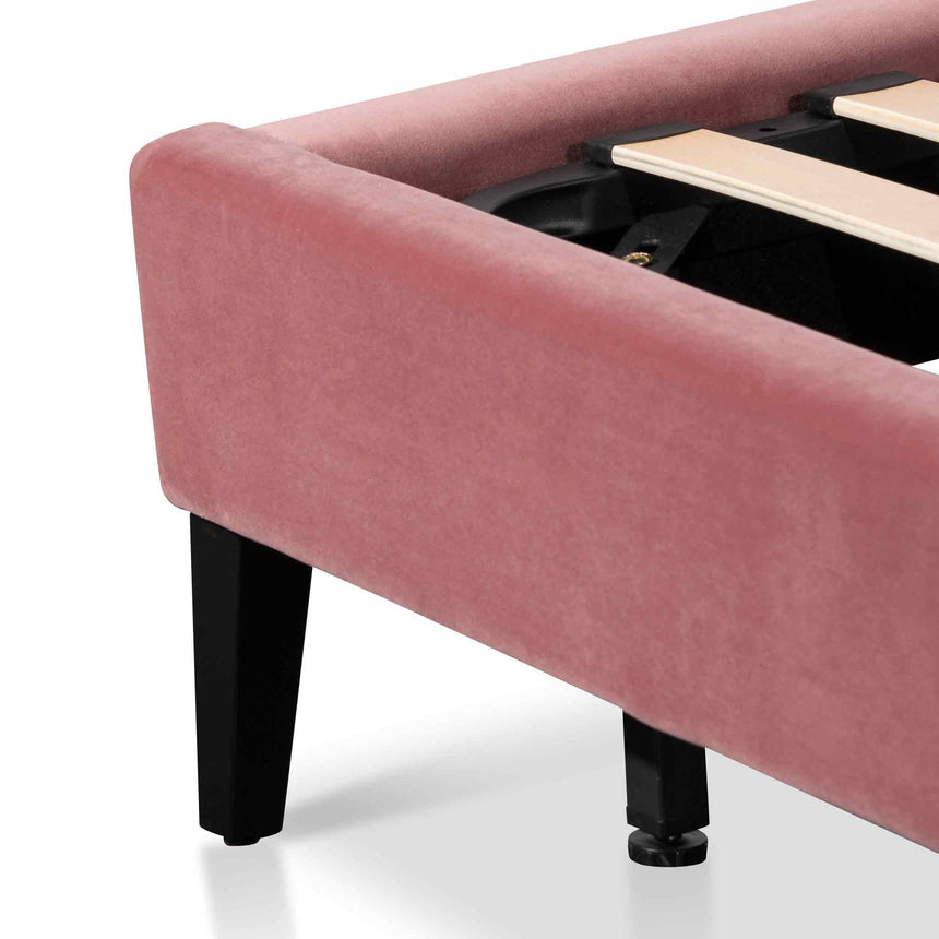 Blush Peach velvet upholstery Wooden slats and black wooden feet Accommodates a King mattress Weight capacity: 300 kg Product is flat packed and requires two-person assembly Note: Bed mattress not included