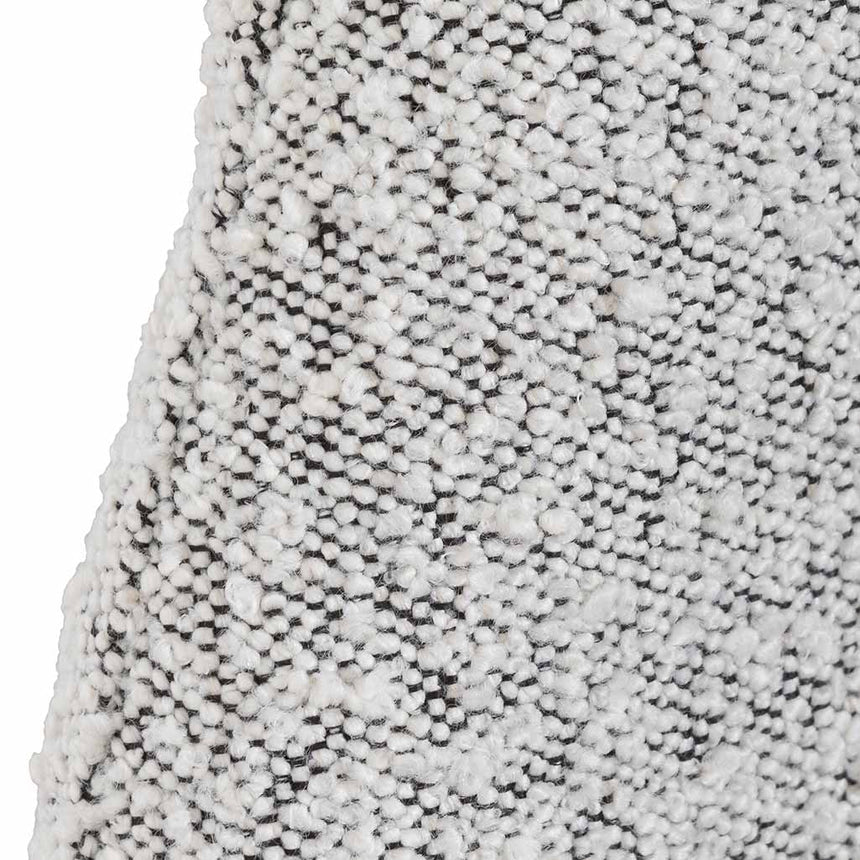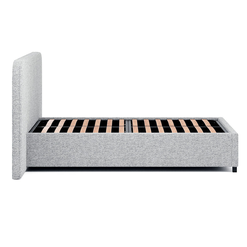 Dusty Pepper boucle polyester/acrylic upholstery Frame and body constructed from timber Matte black wooden square feet Gas-lift mechanism supports up to 50kgs Accommodates a Queen mattress Weight capacity: 300kgs Product comes flat packed and requires two-person assembly and a screwdriver Notes: Bed mattress not included