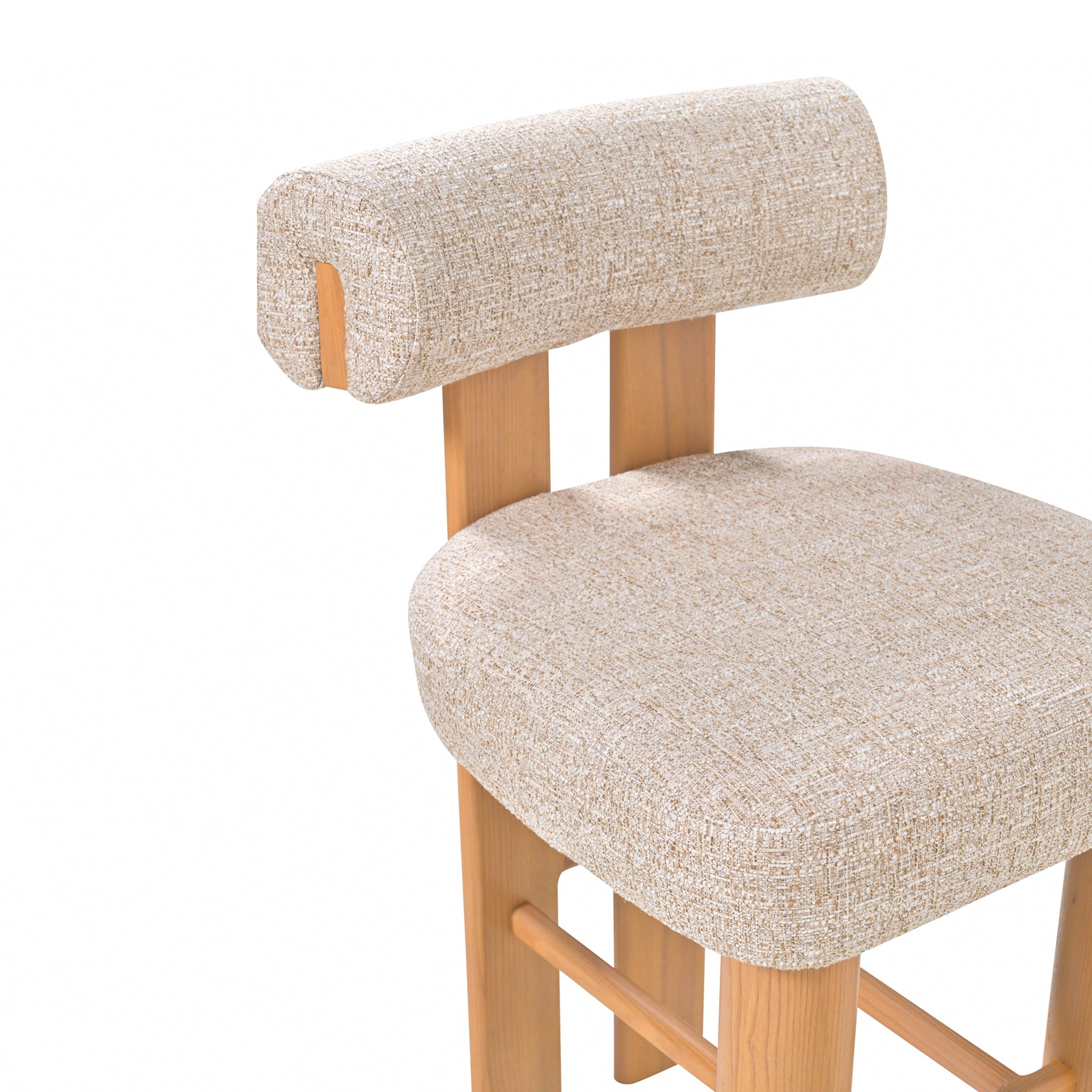 Pale beige polyester upholstery Plywood frame Spring suspension Ash wood legs Foam filling Soft-to-medium seat firmness Clean, geometric silhouette with a playful modernist edge Horizontal and vertical stretcher bars Weight Capacity: 150 kg Product comes fully assembled