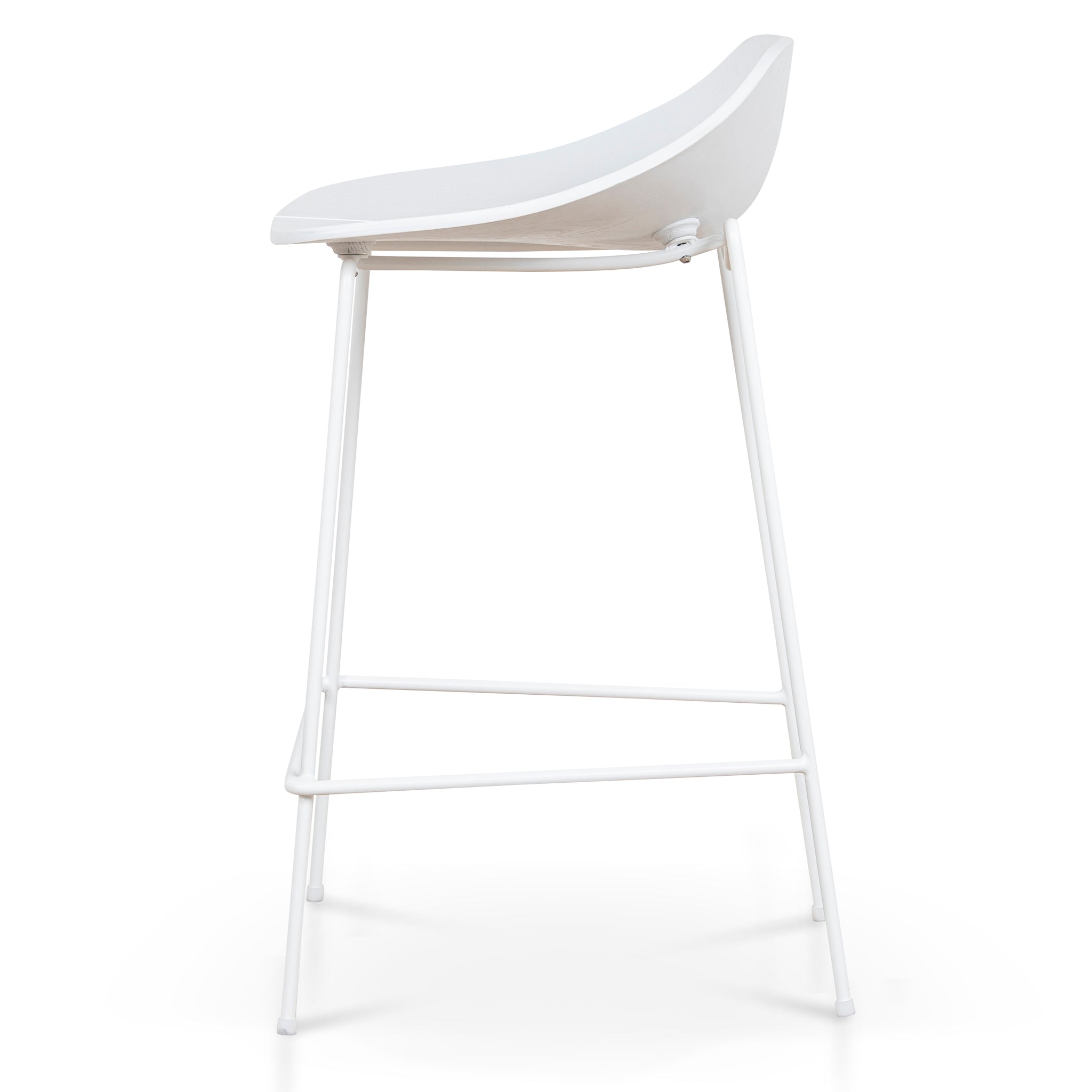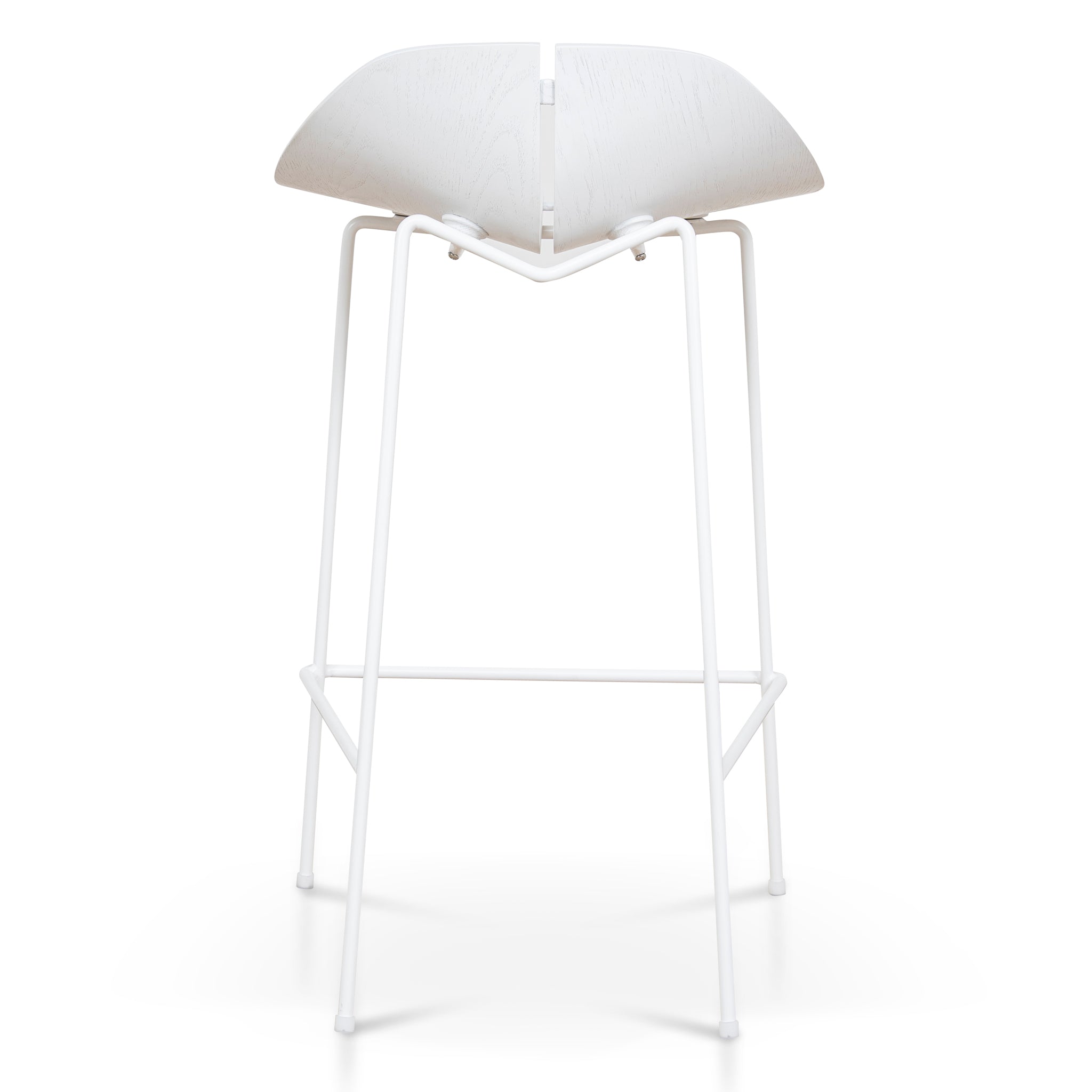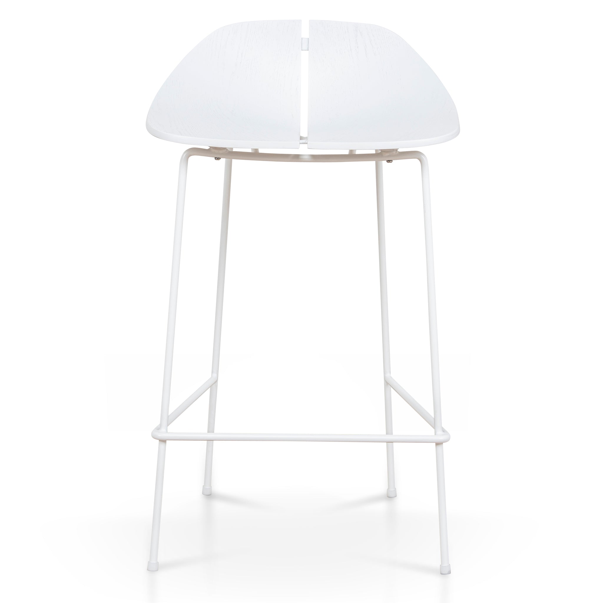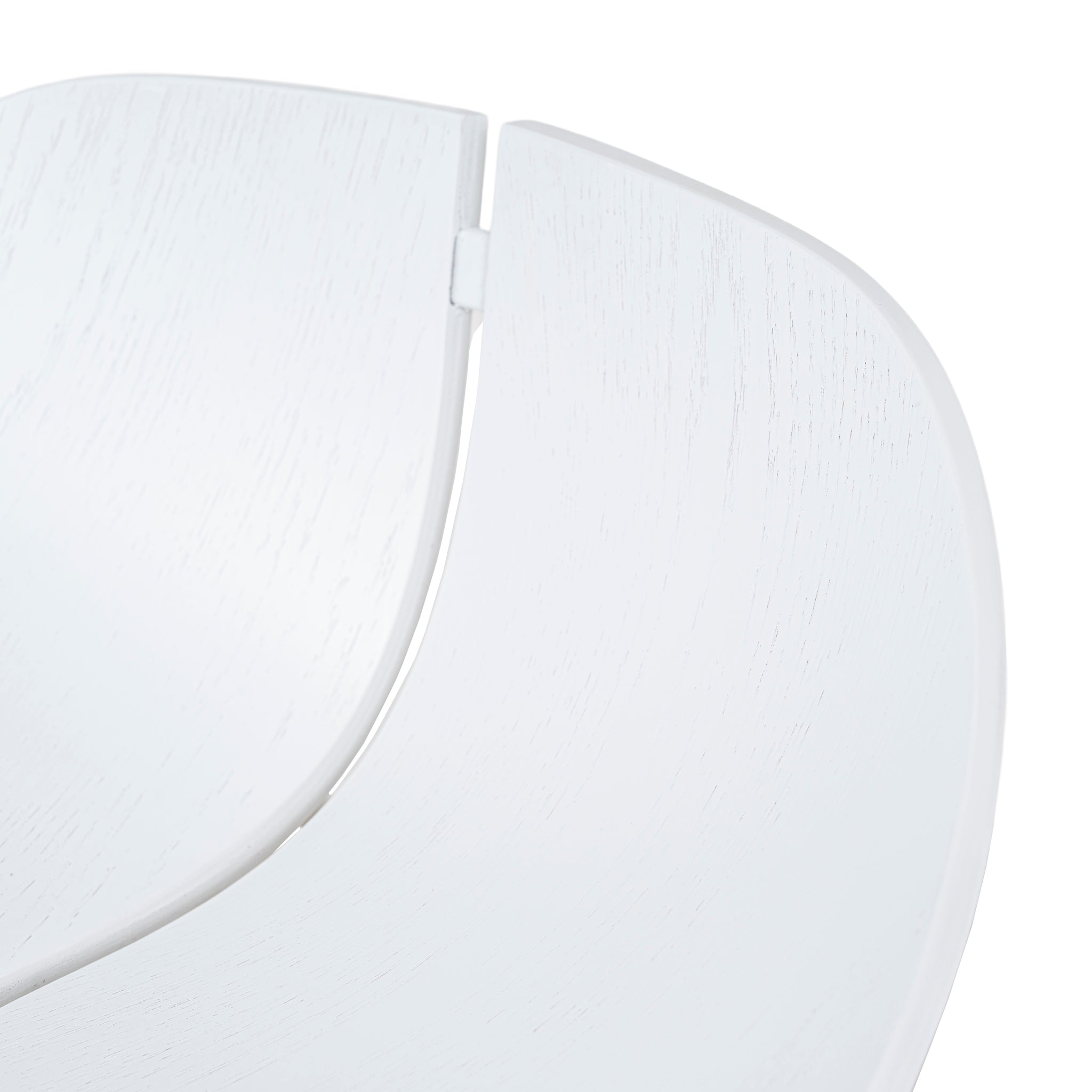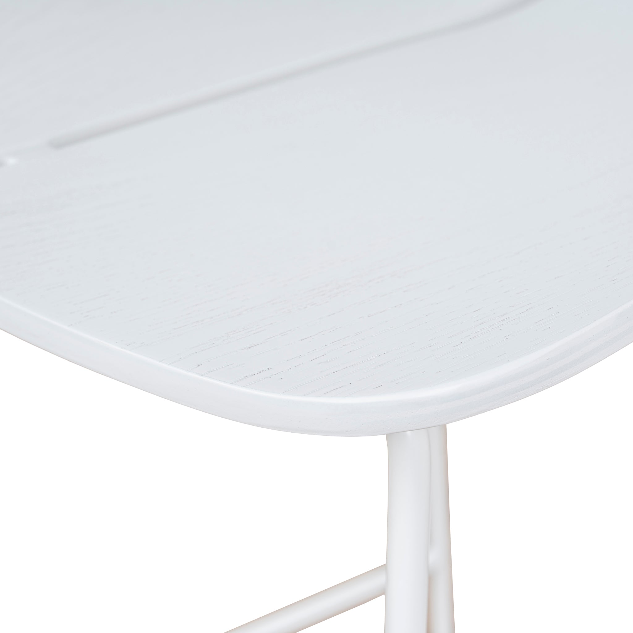 Steel base in matte white finish Curved plywood seat with full white wood Ergonomic design Open-frame structure Neutral monochrome palette Weight capacity: 150 kg Fully assembled for convenience