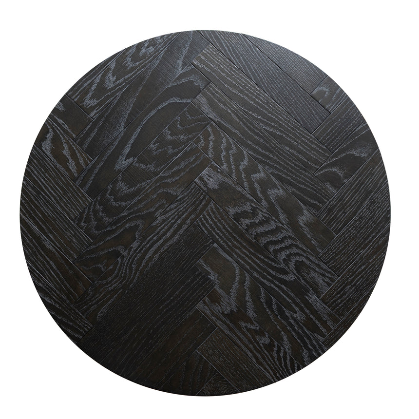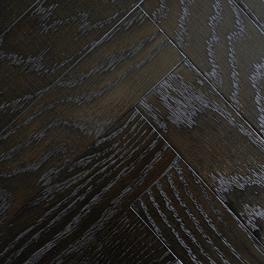 Solid American White Oak top Thin-sawn and wire-brushed oak veneer Solid European Beech wood legs Space-saving nested design Rich dark-toned herringbone top Sculptural steel frame with brass finish This product is supplied flat-packed and requires assembly by two people