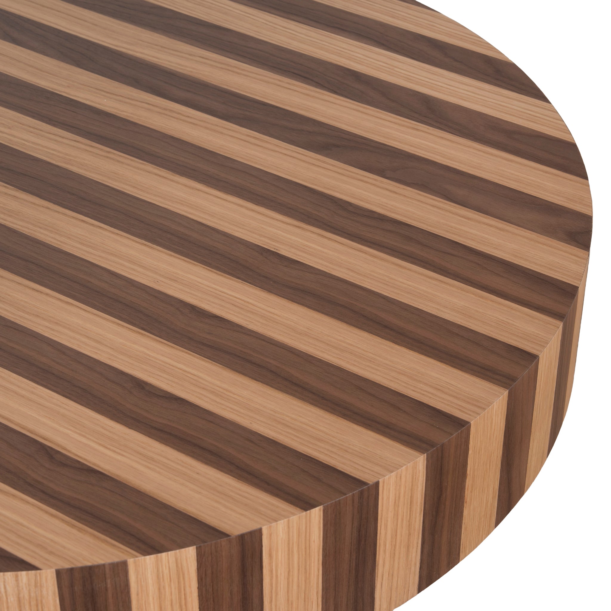 Engineered wood with premium veneer finish Two-tone natural and walnut-style pattern Circular top with sculptural cylindrical legs Generous tabletop with bold presence Weight capacity: 30 kg Product comes fully assembled