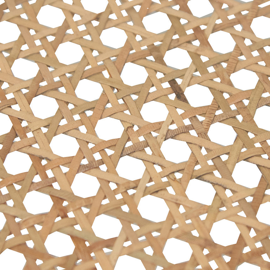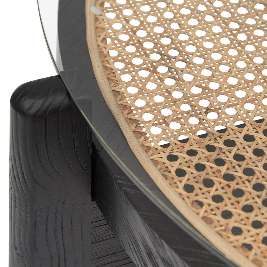Tabletop in a clear tempered glass build Second-tier shelf made with handwoven rattan Frame and leg detailing in a matte black oak wood finish Hand carved wood textures visible throughout Tempered glass table top sits plush within frame Product requires two-person assembly