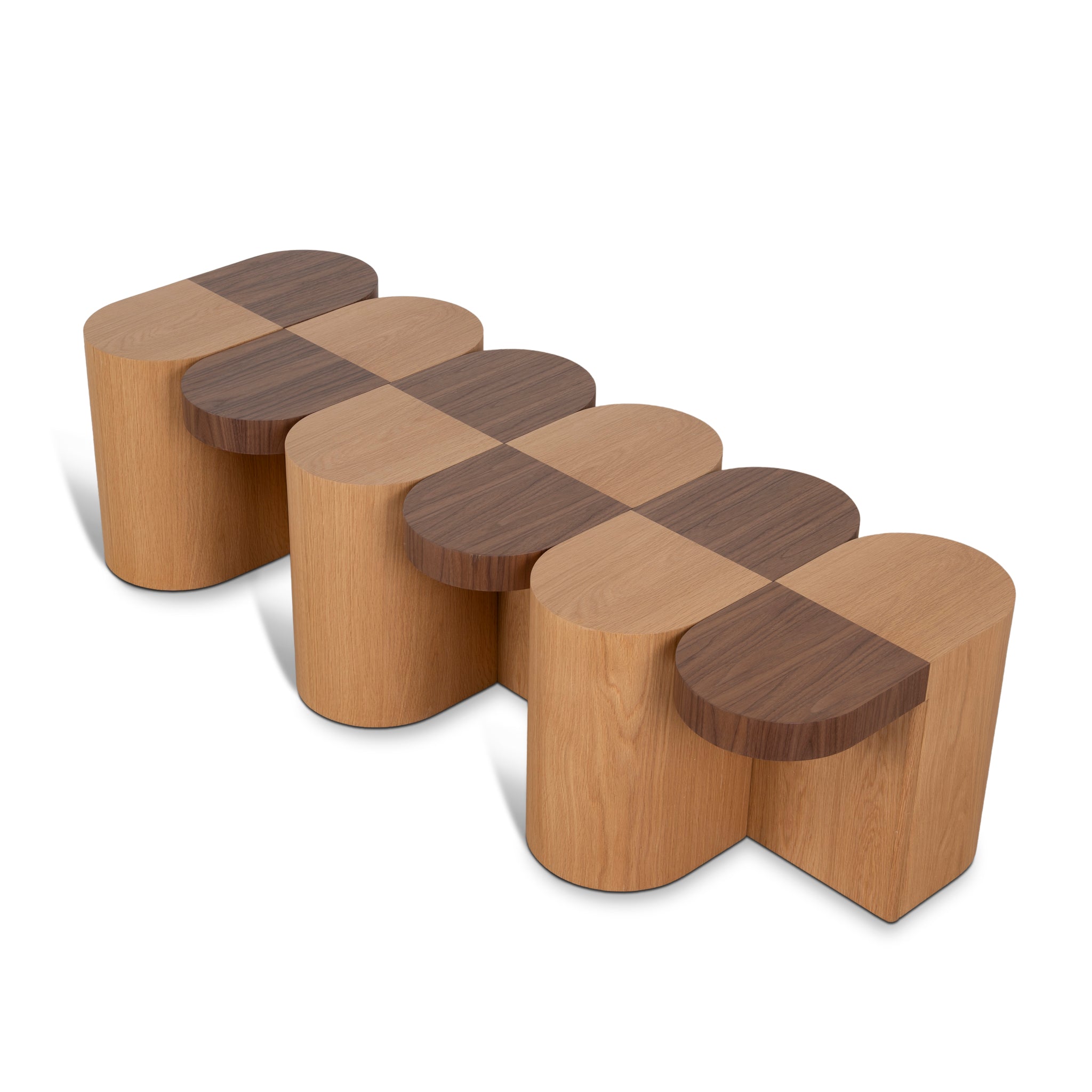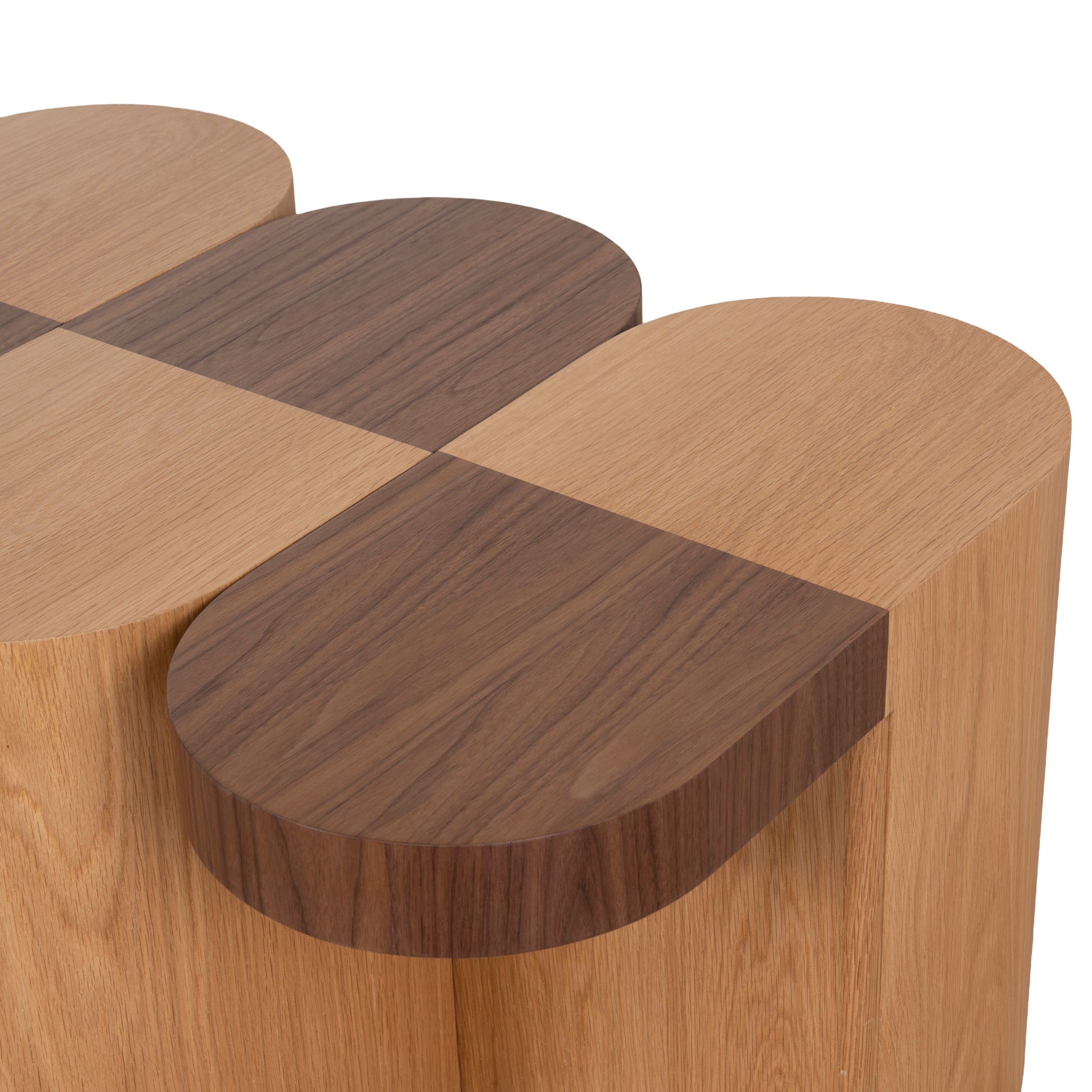 Engineered wood with veneer finish Two-tone natural Solid, stable build Pill-shaped segments Smooth, flowing curves Wide drum-style bases Weight capacity: 30 kg Product comes fully assembled