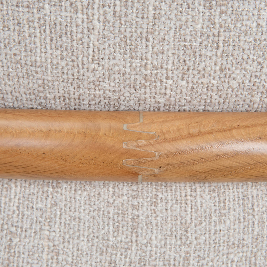 72% polyester, 28% acrylic upholstery Oak wood frame and legs Natural oak finish Medium-firm seat Foam filling Rounded slightly angled backrest Well-cushioned Subtle detailing on wood joints Weight Capacity: 200 kg Fully assembled