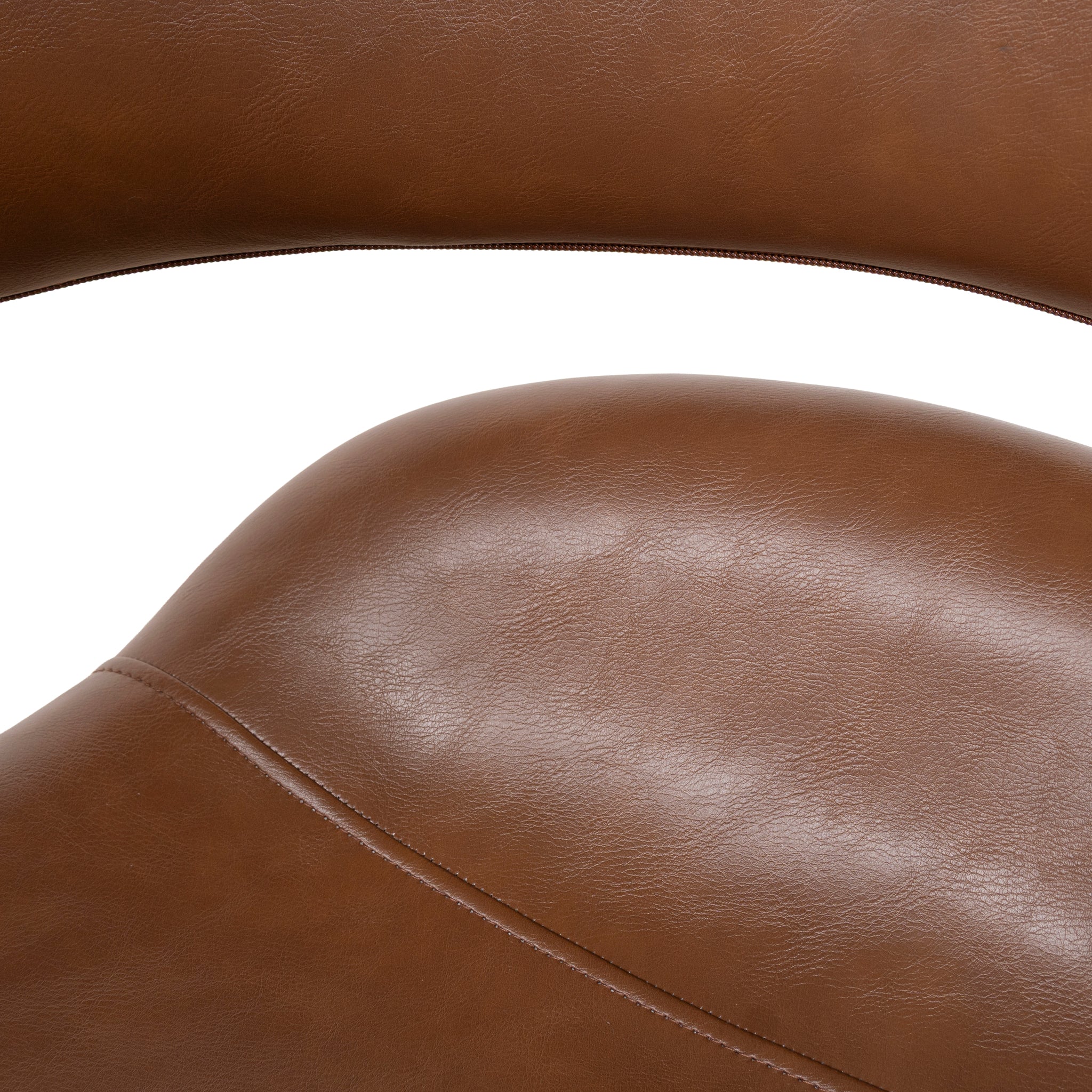 65% resin and 35% base cloth upholstery Timber and iron frame Black powder-coated metal legs Foam-filled seat wrapped in faux leather Soft-medium seat firmness Unique cut-out back design Curved armrests Antique brown tone Weight Capacity: 150 kg Minor assembly required