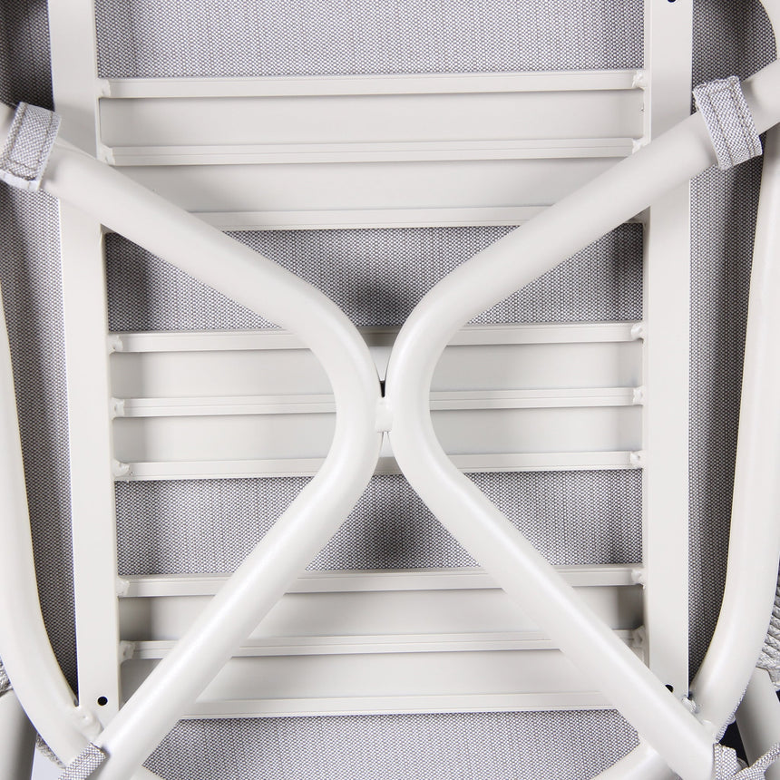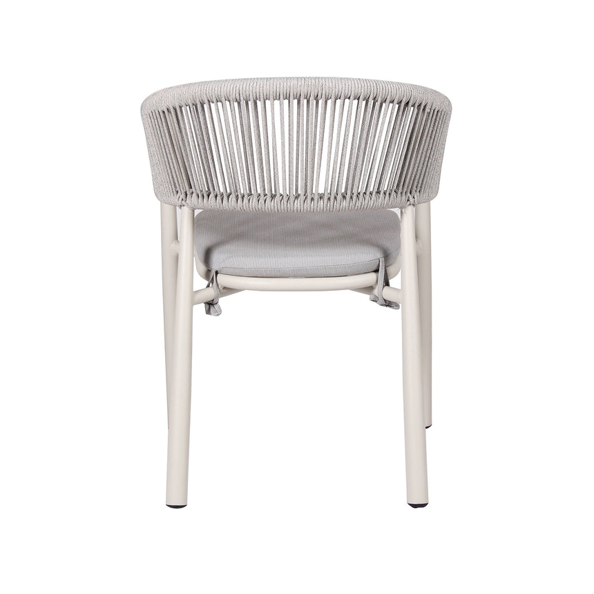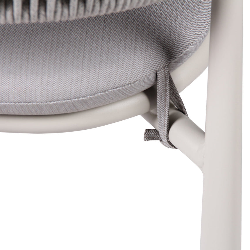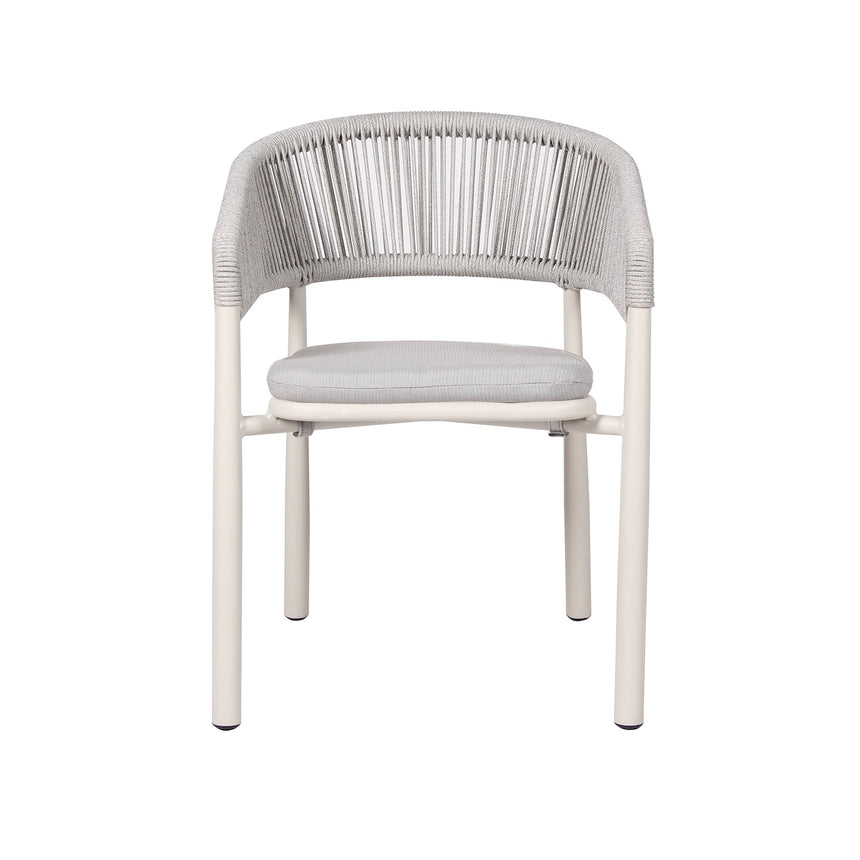 Light grey polyester fabric upholstery Aluminum frame and legs 6mm light grey rope seat Rope with spandex polyester core Outer layer of rope; UV-resistant plastic and high-strength yarn 4cm thick cushioned seat with foam filling Soft-to-medium seat firmness Curved backrest and armrests Versatile tones suit any outdoor decor Weight Capacity: 200 kg Product comes fully assembled