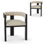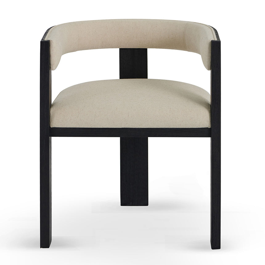 Seat and backrest upholstered in 90% polyester and 10% Linen Fabric has a Dawn Beige finish 100% Foam filling for soft medium firmness Barrel back tripod frame made of solid ELM wood finished in black Crisp angles and curving contours 3× thick flat legs upholding the arched contour Product is suitable for commercial use Weight Capacity: 120 kg Product comes fully assembled