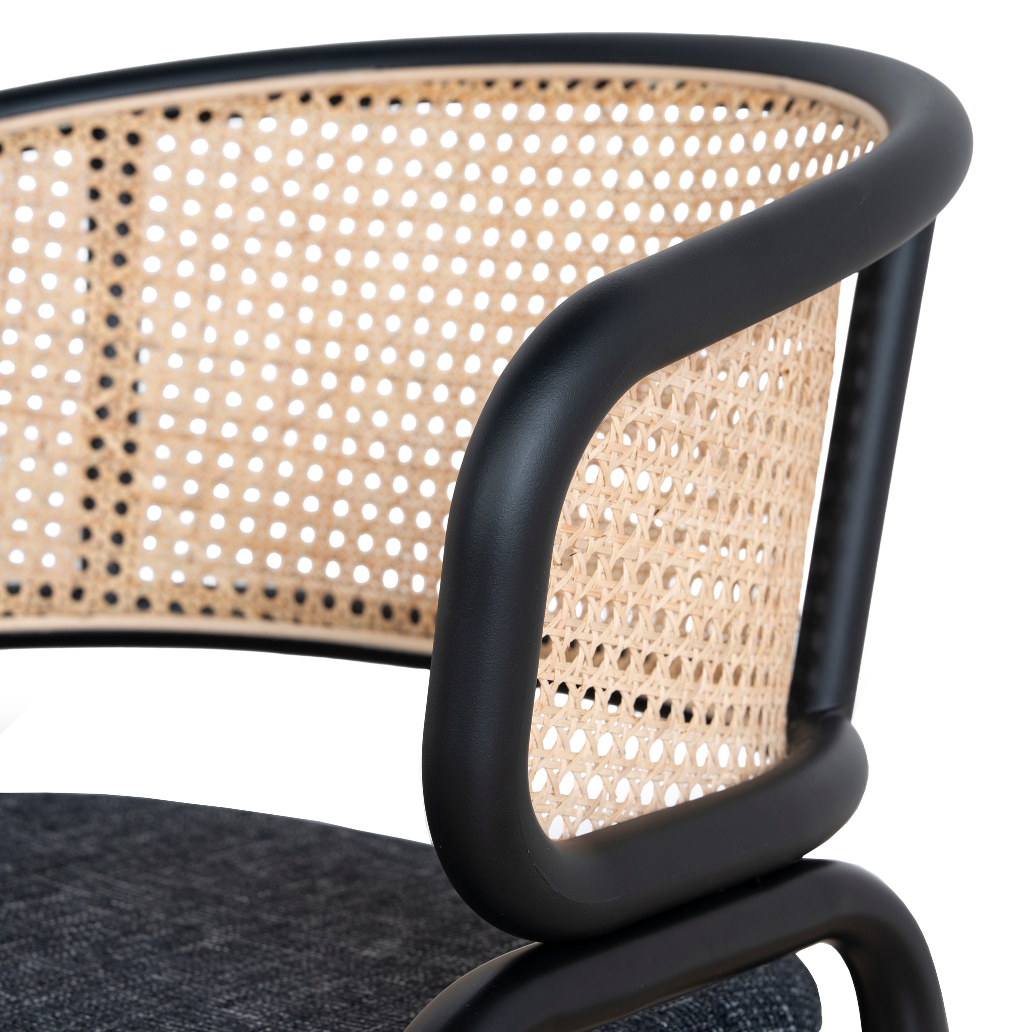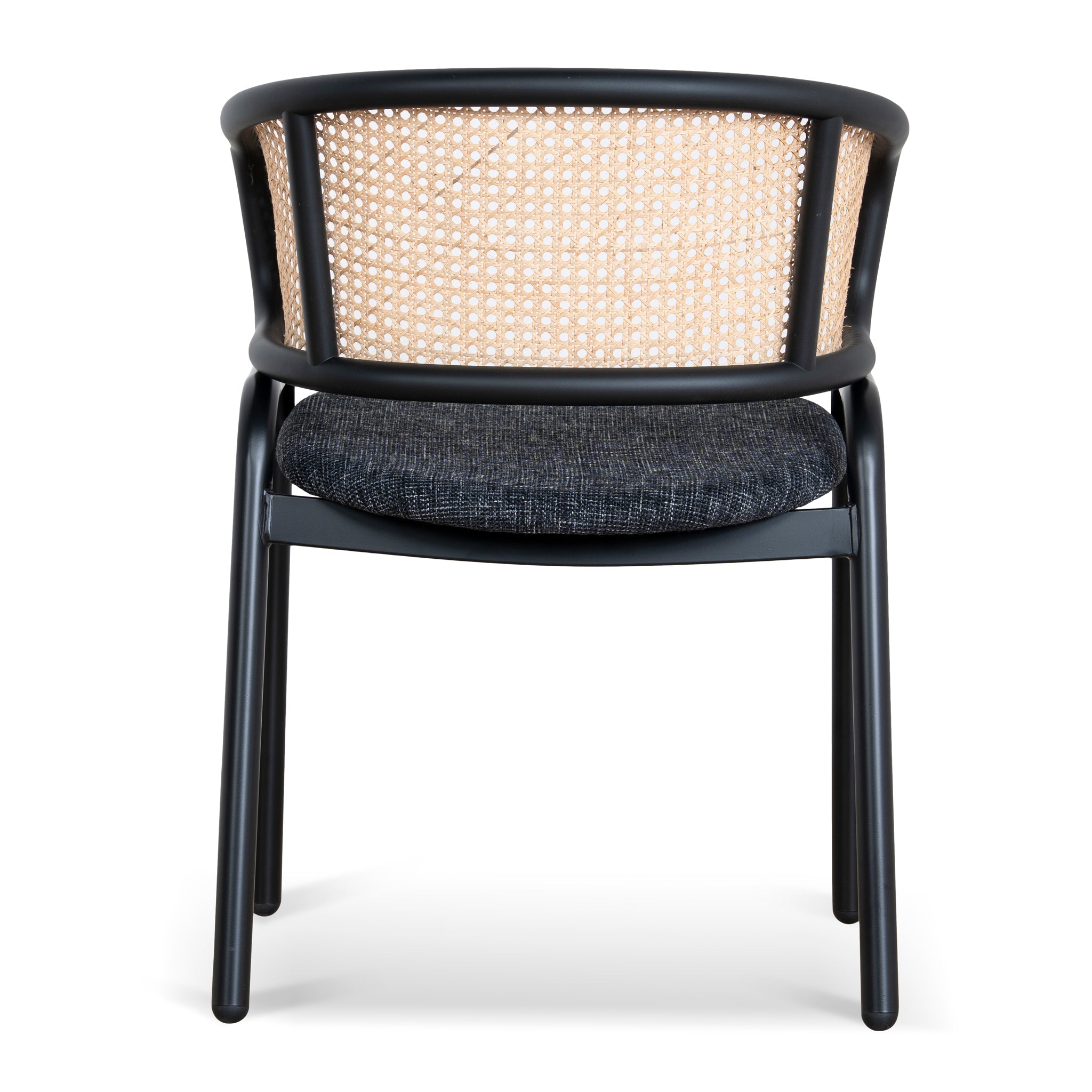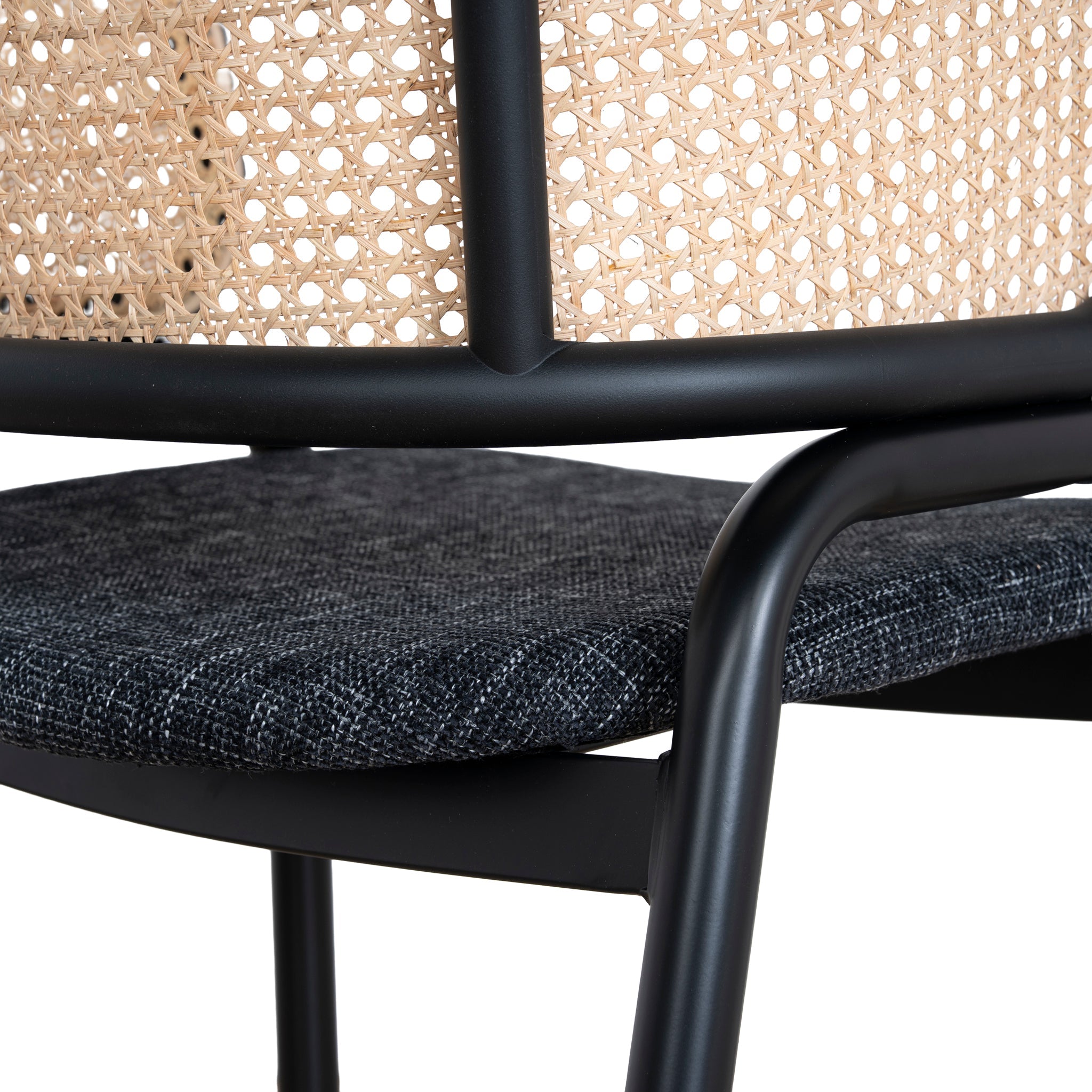 Dark grey polyester upholstery Metal frame and legs Woven rattan back Foam and fiber filling Medium-firm seat Ergonomic curved backrest Slightly raised arm curve Weight Capacity: 150 kg Minor assembly required