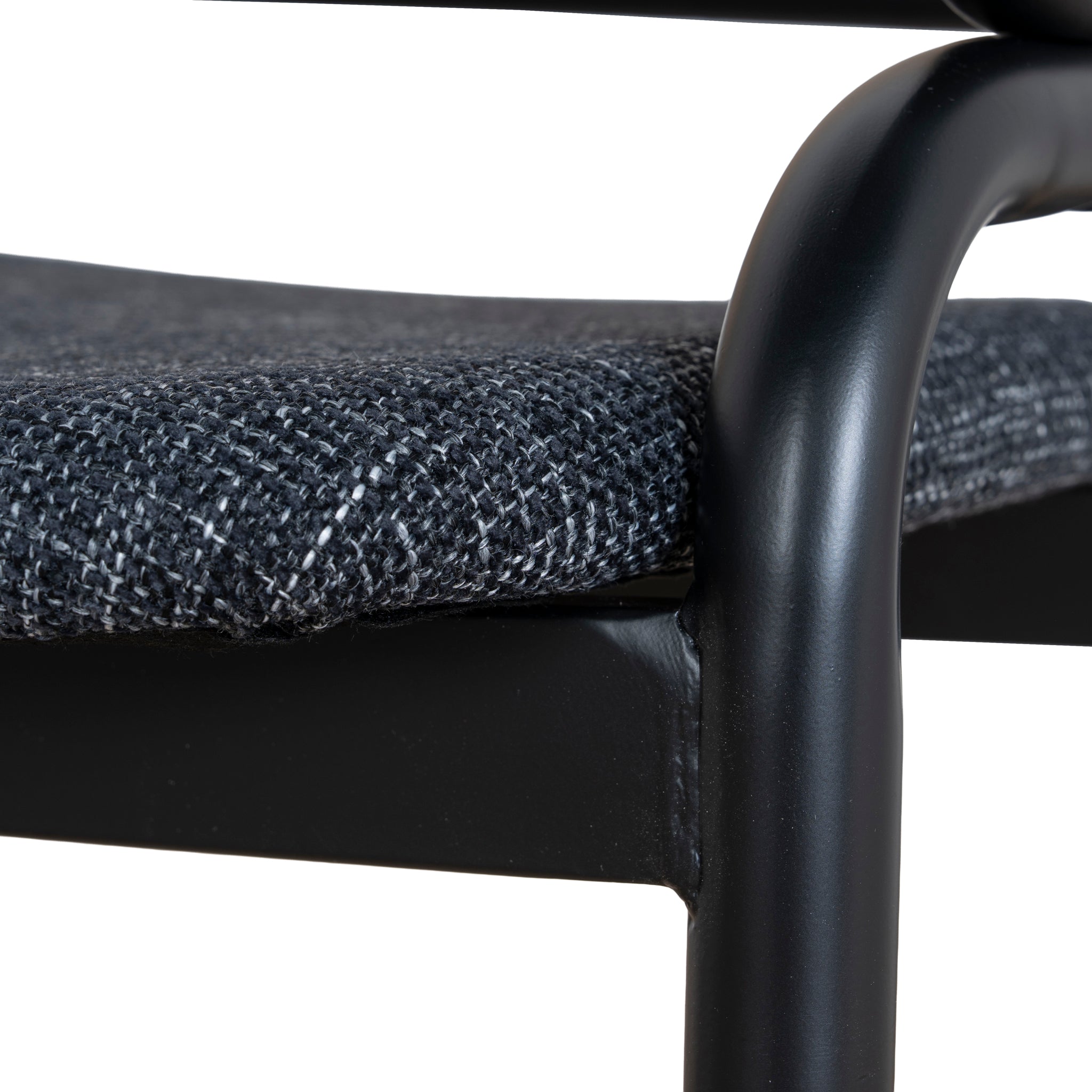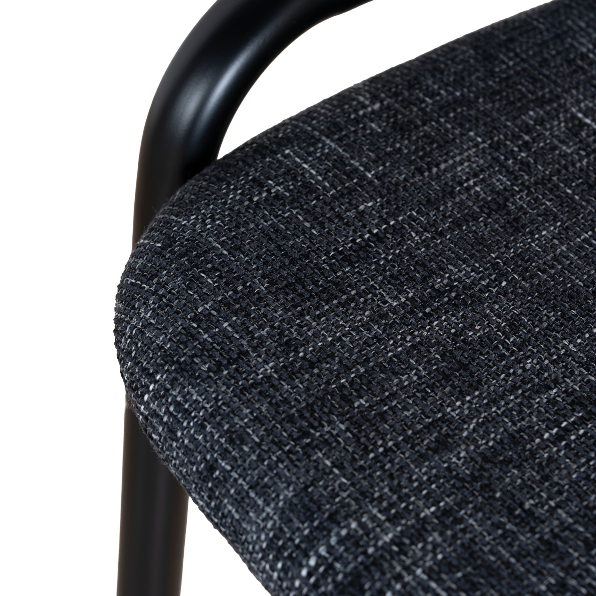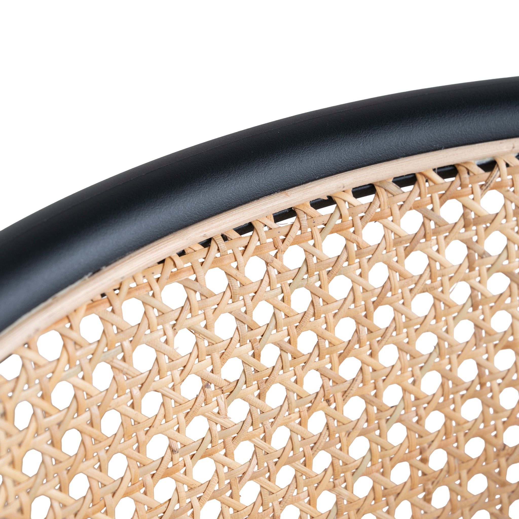 Dark grey polyester upholstery Metal frame and legs Woven rattan back Foam and fiber filling Medium-firm seat Ergonomic curved backrest Slightly raised arm curve Weight Capacity: 150 kg Minor assembly required